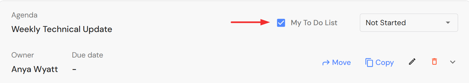 In the Meetings module, you can add your agenda items to your dashboard. If you are the owner of specific meeting agenda items, click on the 'My To Do List' checkbox on each agenda and they will appear on your dashboard.
