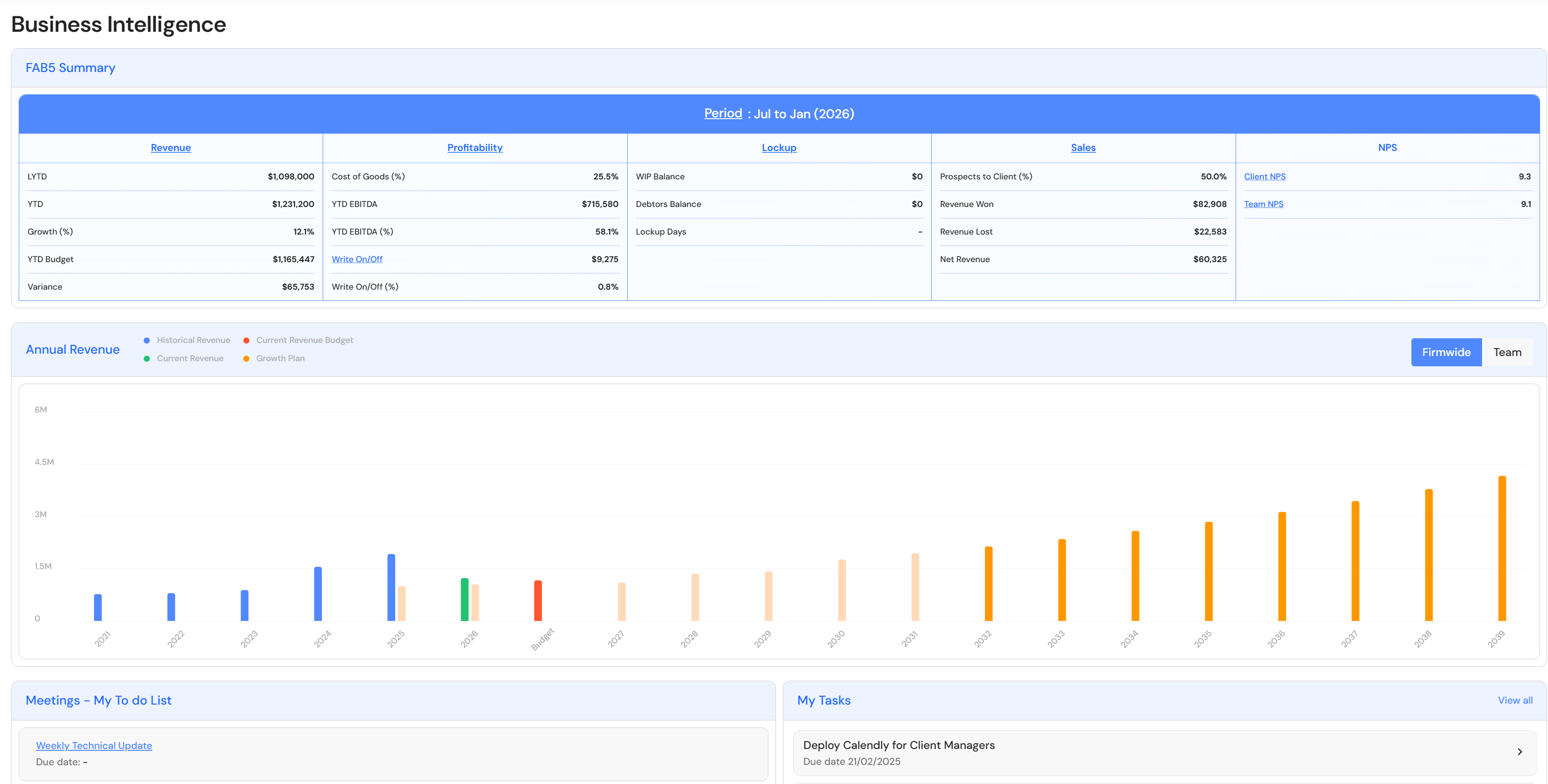 Executive users have a collective snapshot of current business performance and key areas of focus. Focus points include: