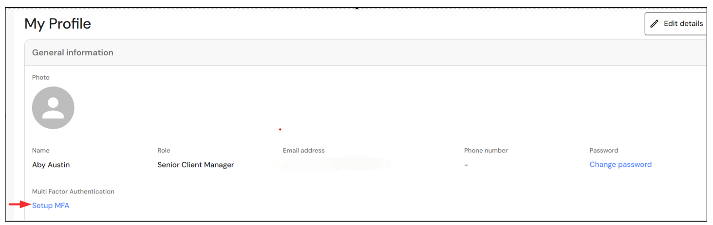 To setup Multi Factor Authentication, go to your user profile in the top right corner and click on 'Edit profile'.