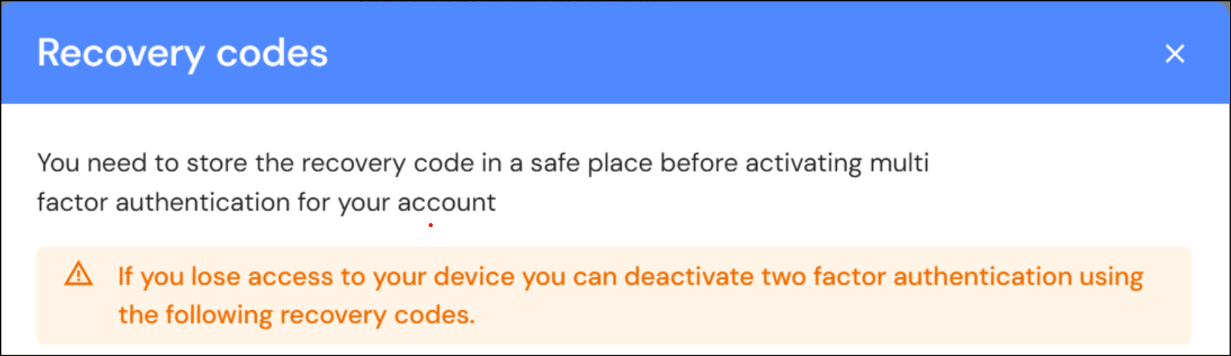 You will receive a 6 digit code to activate MFA via email or sms. Keep a copy of your recovery codes in a safe place. IMPORTANT: You will need your recovery codes to deactivate MFA.