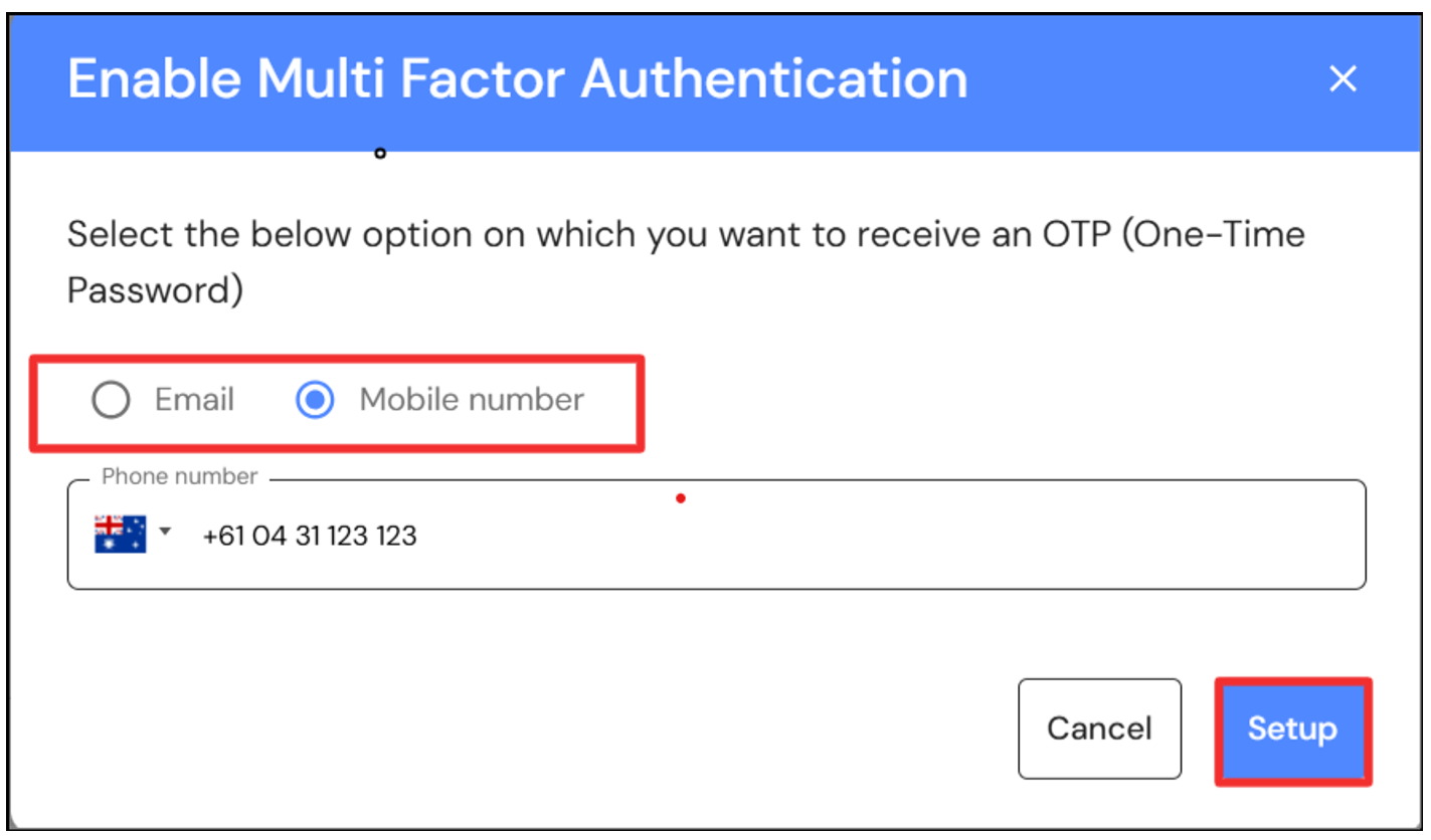 Select your preferred option; Email or Mobile number and click on 'Setup'.