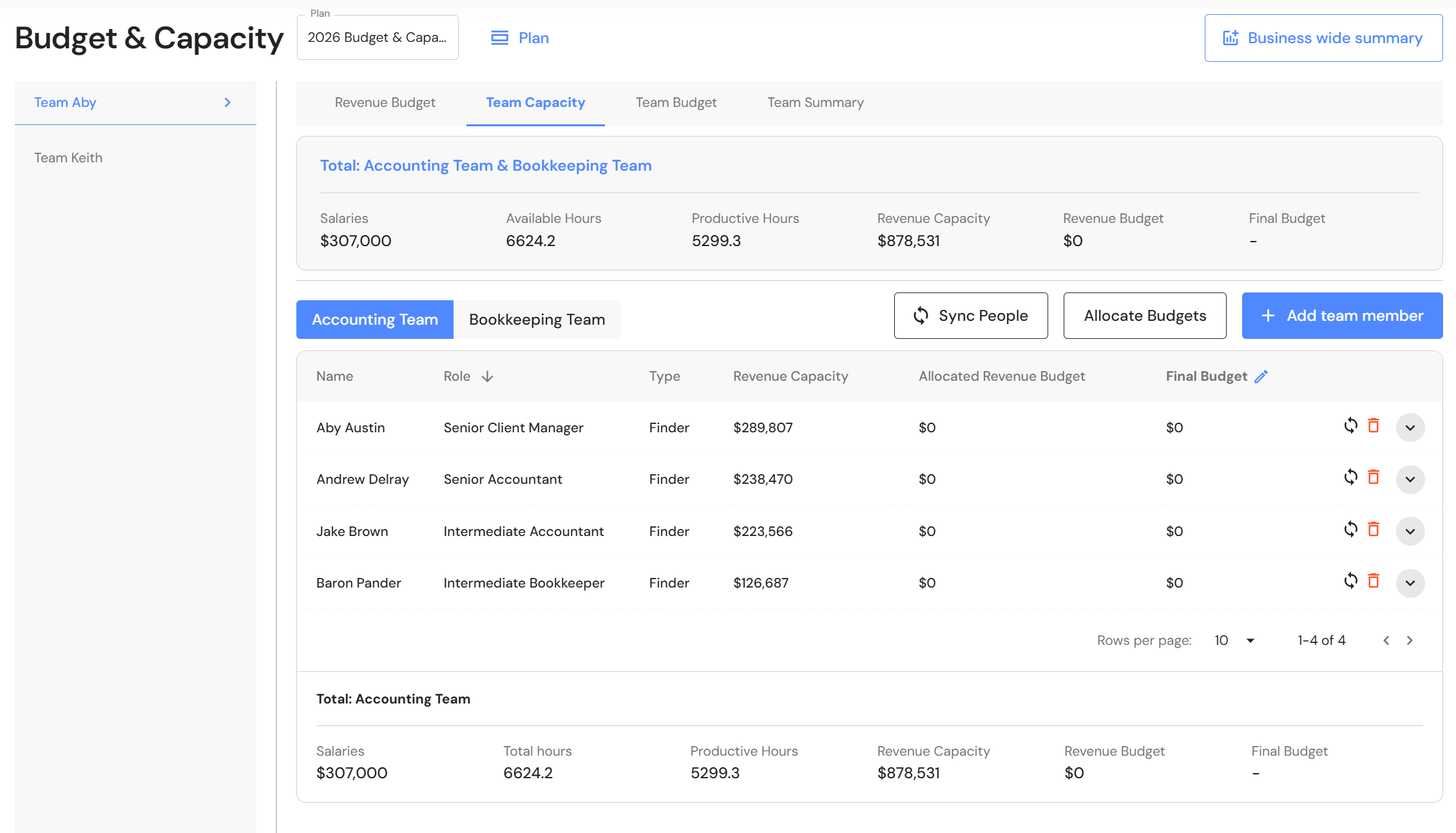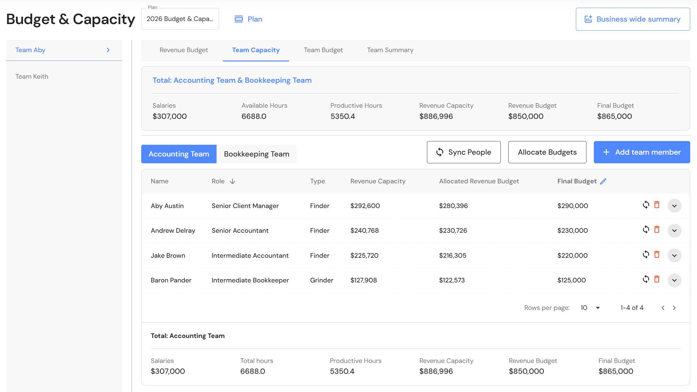 Budget & Capacity: Team Capacity for Production Team - Team AbyRevenue - XPM Invoices for Manager Aby, Andrew & Jake are grouped into Team Aby