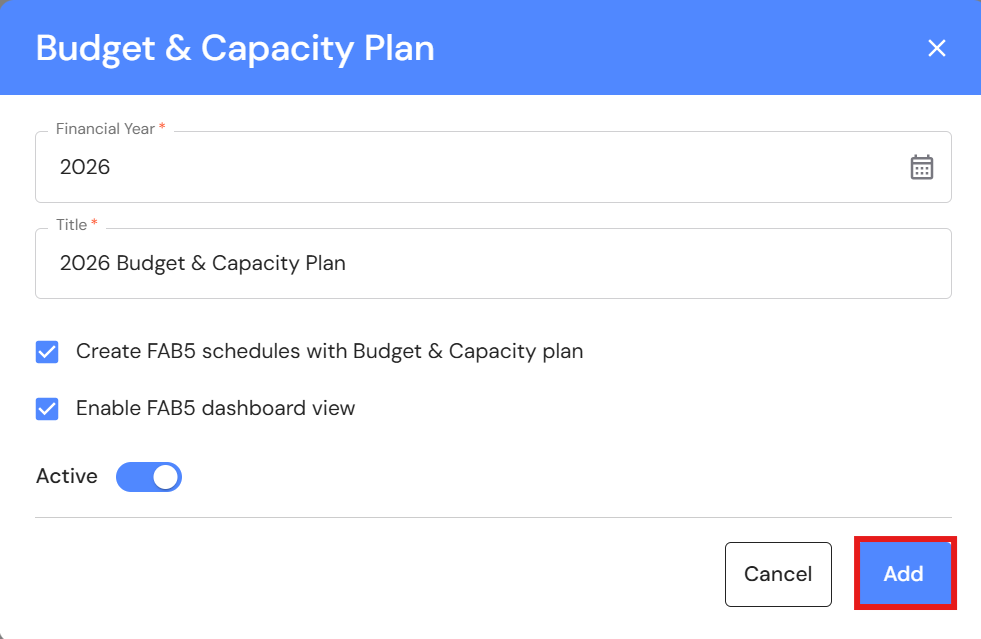 - Add a Title e.g. 2026 Budget & Capacity Plan.