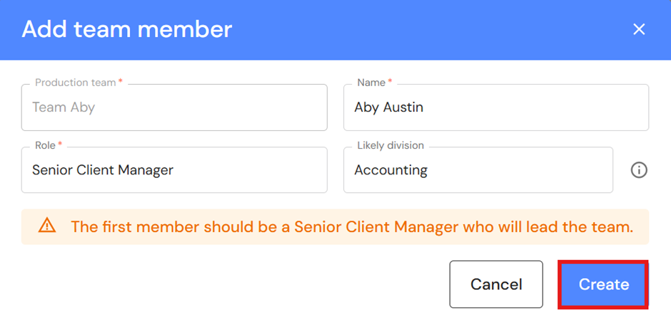 - The first person to add is the team's Senior Client Manager (Partner, Owner, or experienced senior) who is responsible for the leading the team.