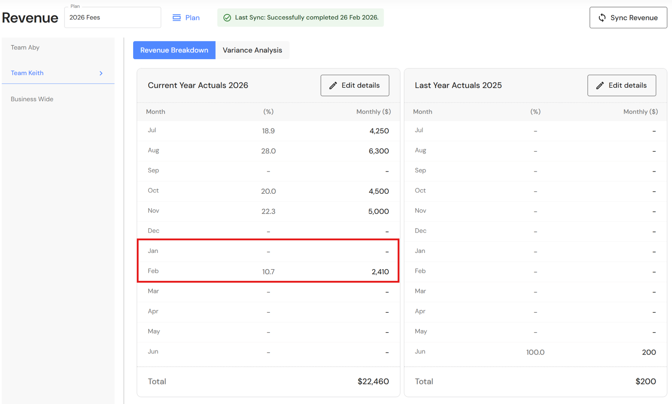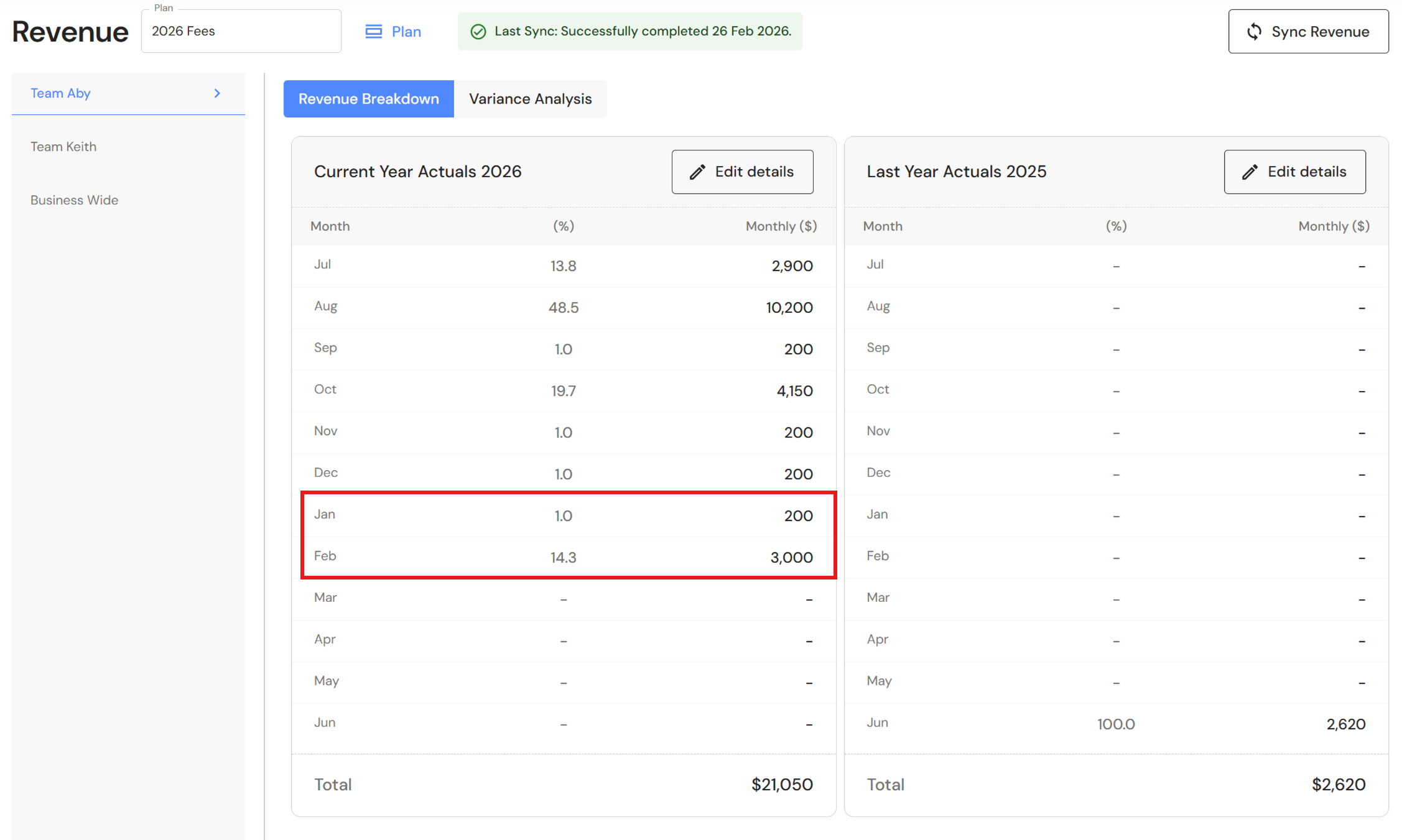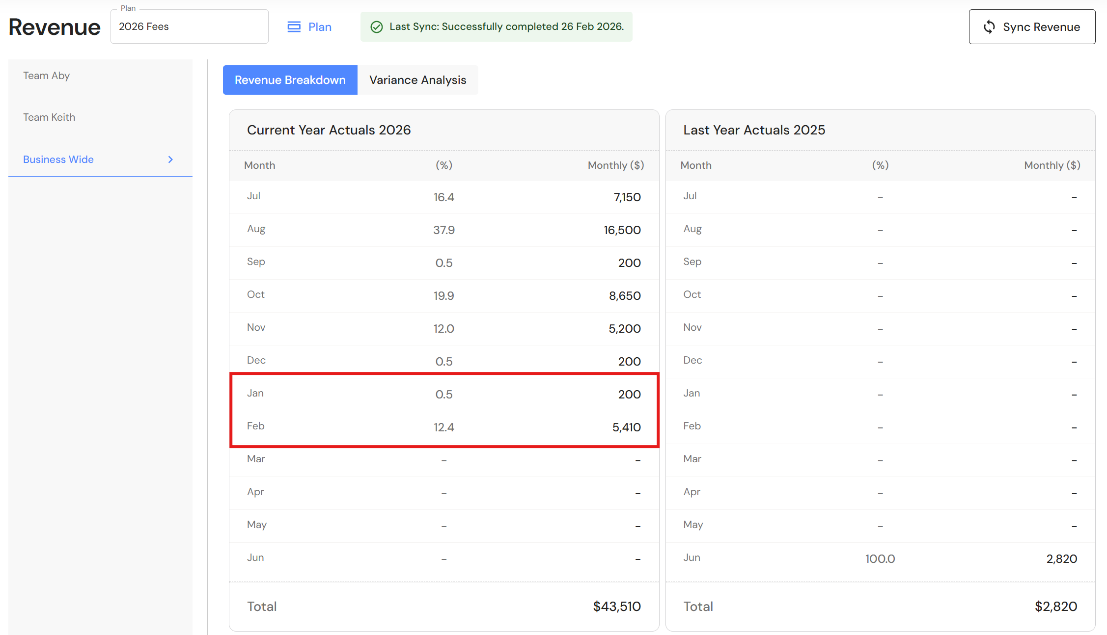 | Production Team | Managers | Jan 2026 | Feb 2026 | ... Total |