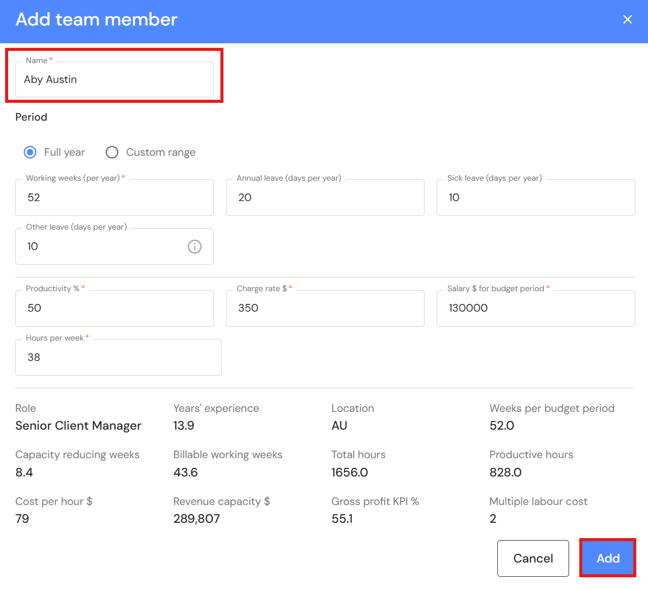 - If mandatory HR fields are empty, you cannot add the person to Team Capacity in the Budget & Capacity plan.