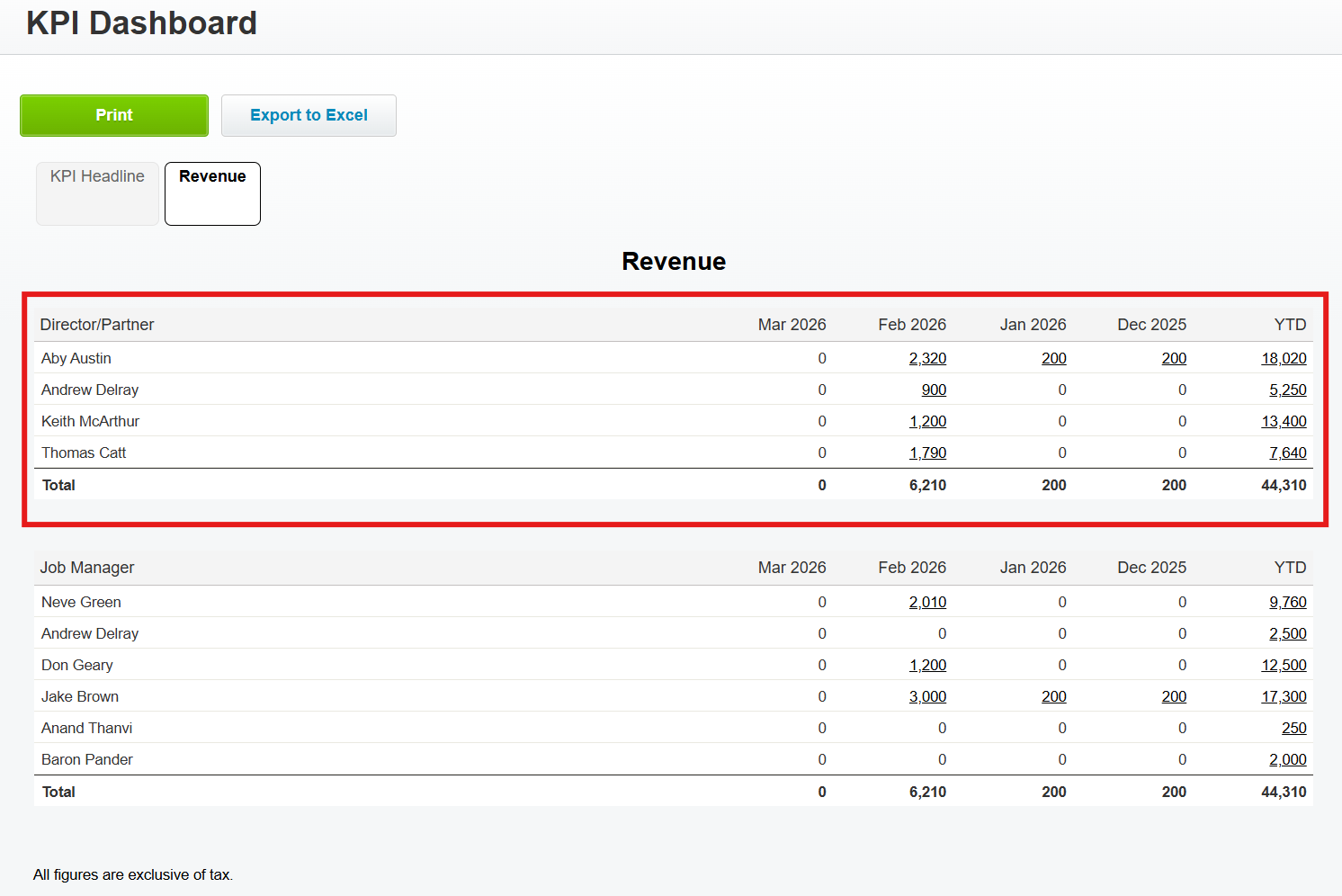 NB* The Job Manager in the KPI Dashboard is not the Manager assigned to Clients. It represents staff assigned as the Manager on Jobs. If you setup XPM custom reports, data labels are distinguished by the location in the square brackets i.e. [Client] Job Manager and [Job] Job Manager.