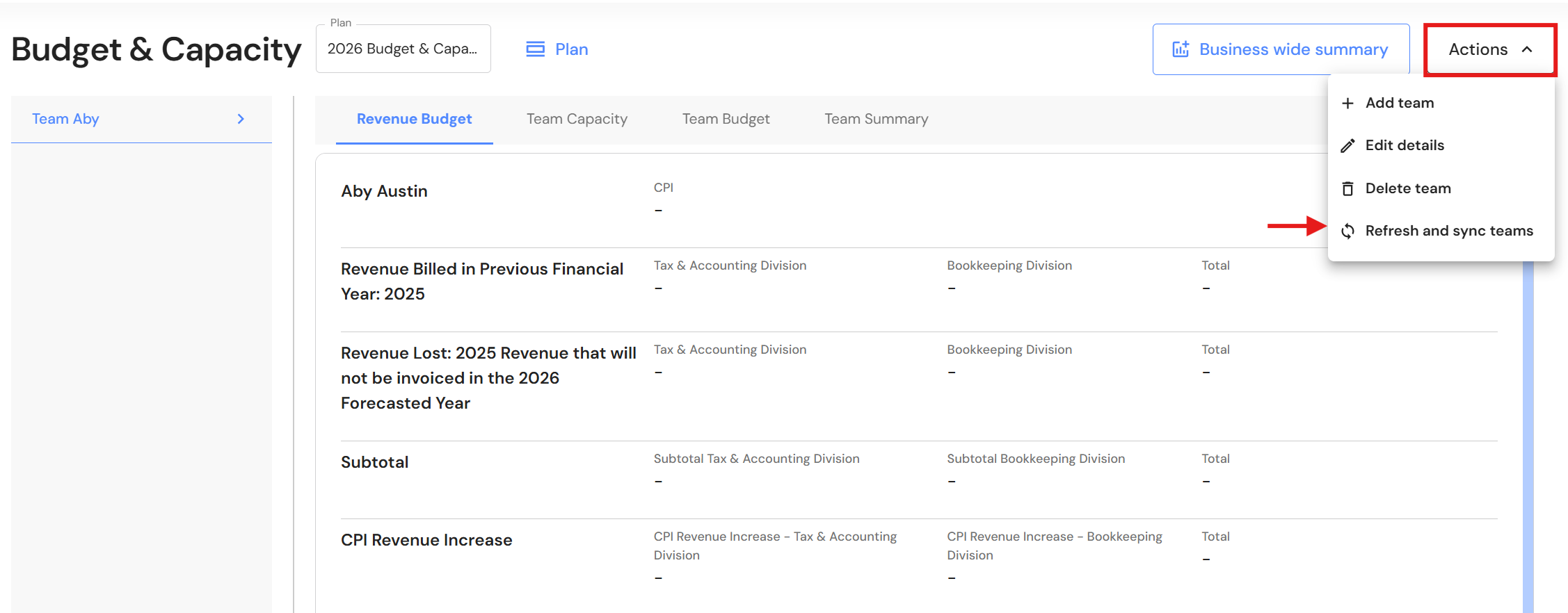 NB* If you are adding more teams to the capacity plan, you can refresh and sync teams after you have added your final team.