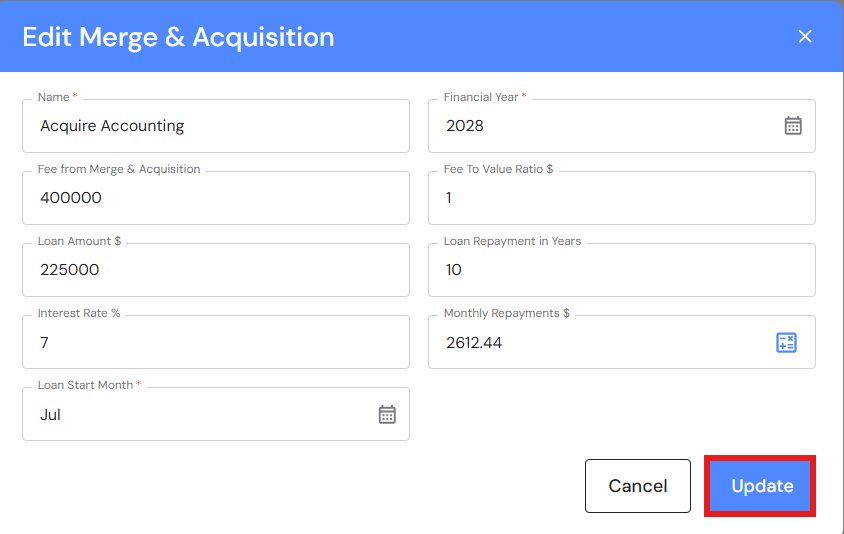 - Revenue from Merge & Acquisition - Enter the revenue that your business will purchase/acquire.