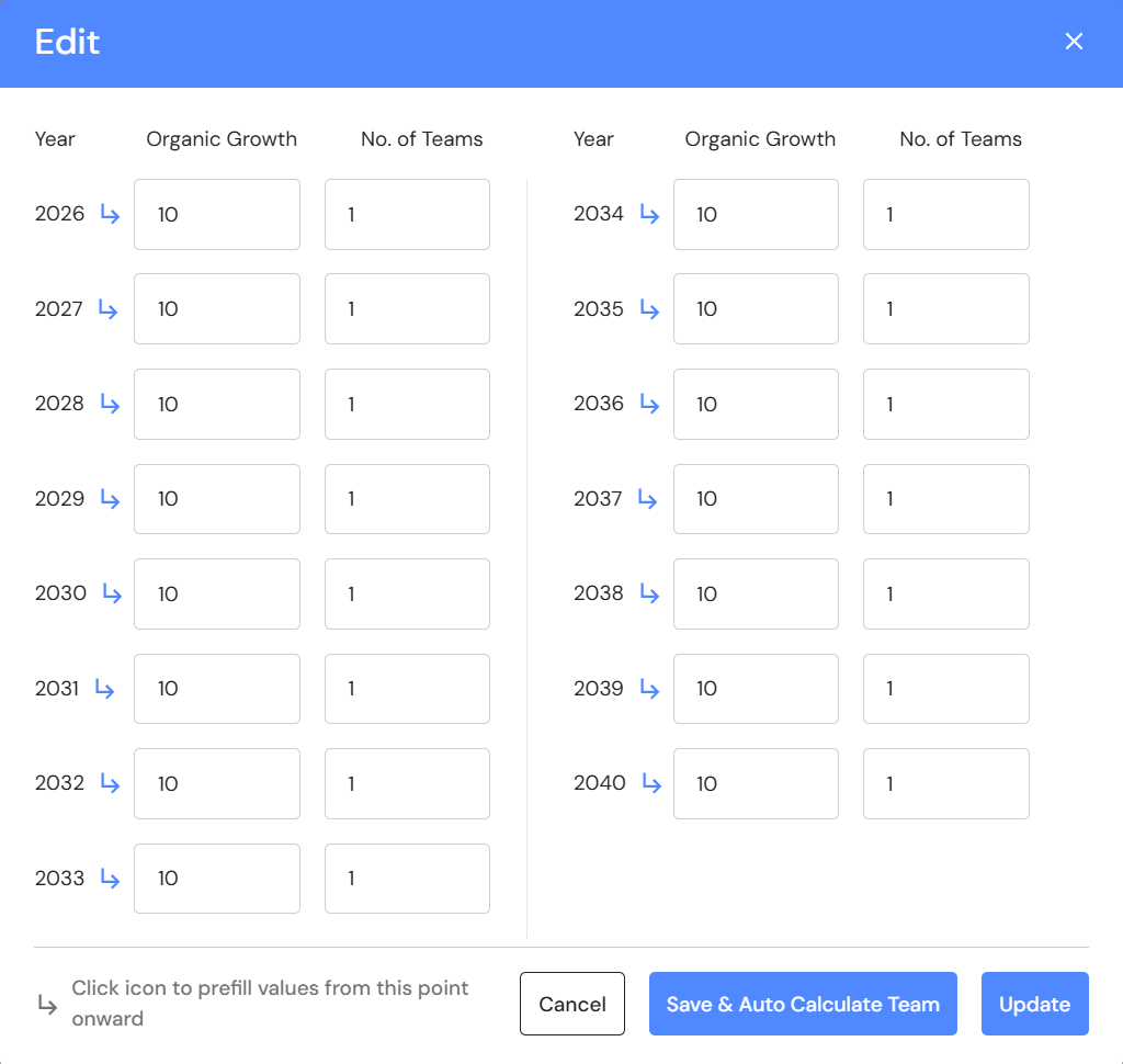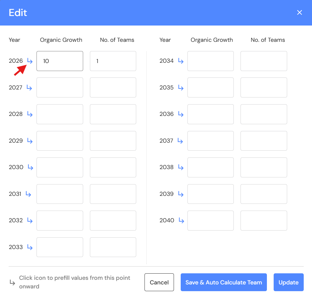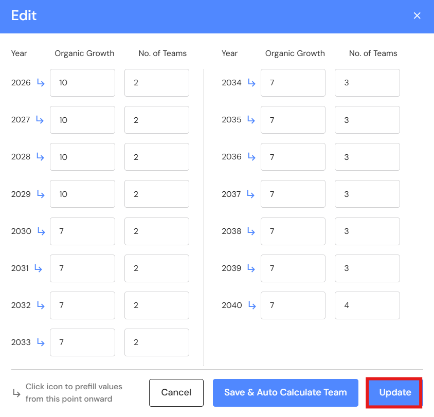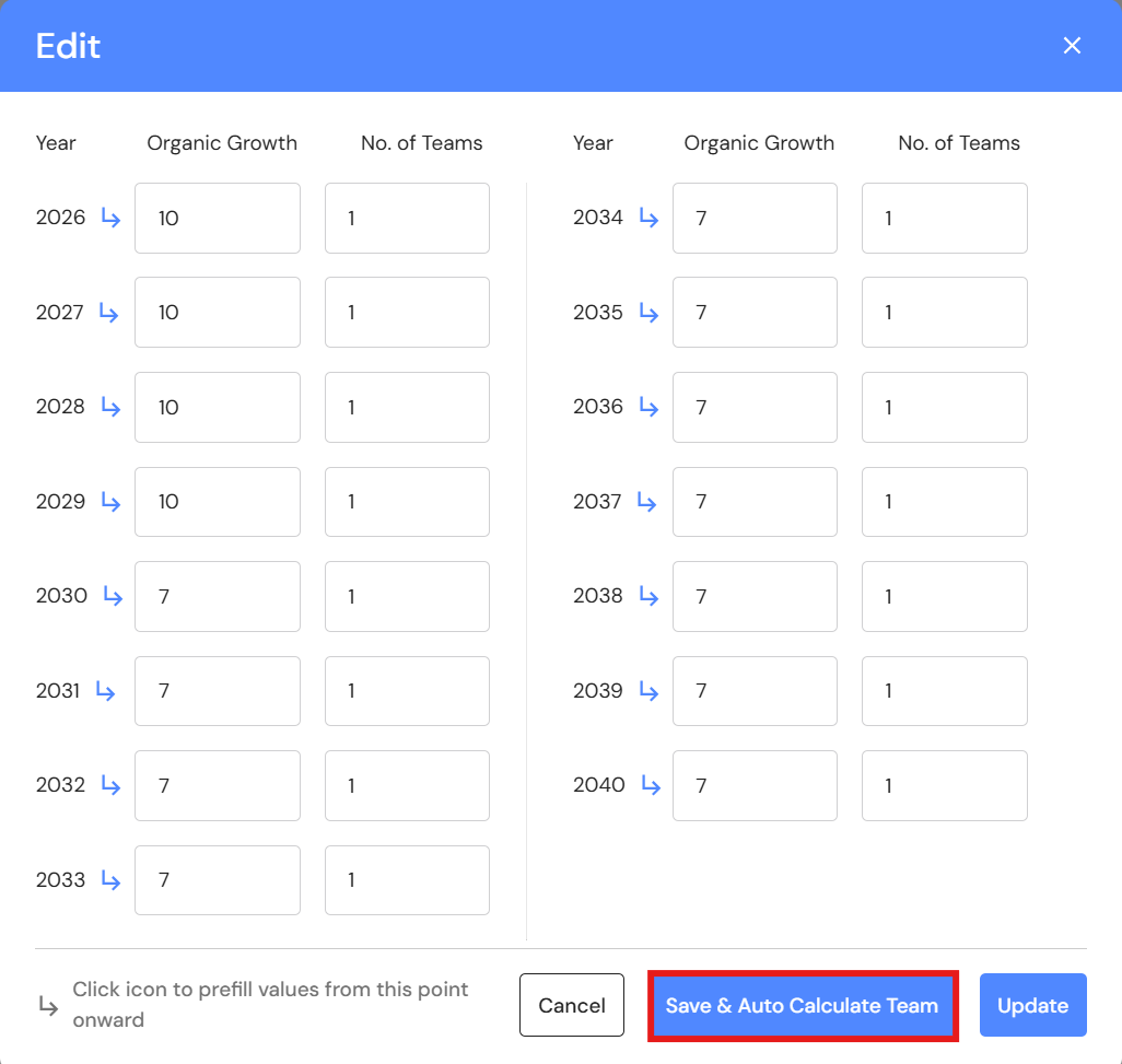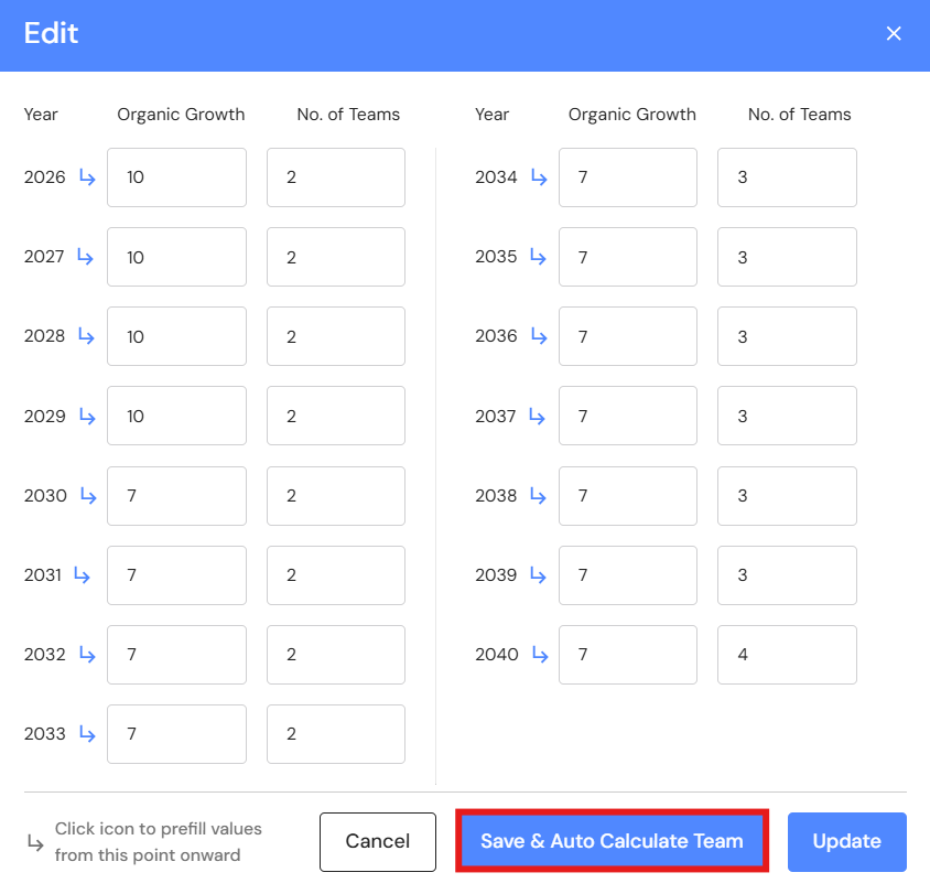 - Click on 'Save & Auto Calculate Teams'. This feature will review the revenue data for every year and automatically assign the number of million dollar teams. The calculation is based on one Ideal Team for every million dollars of revenue. As your revenue reaches $1 million it's time to build a new team to sustain the next growth phase.