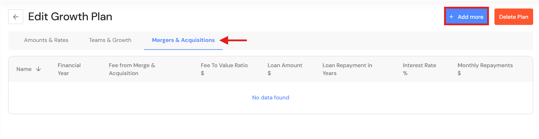- Click on the 'Merge & Acquisitions' tab, then click on '+Add more'.