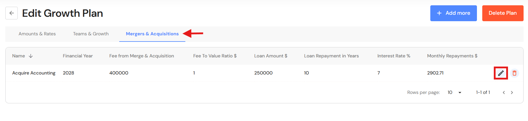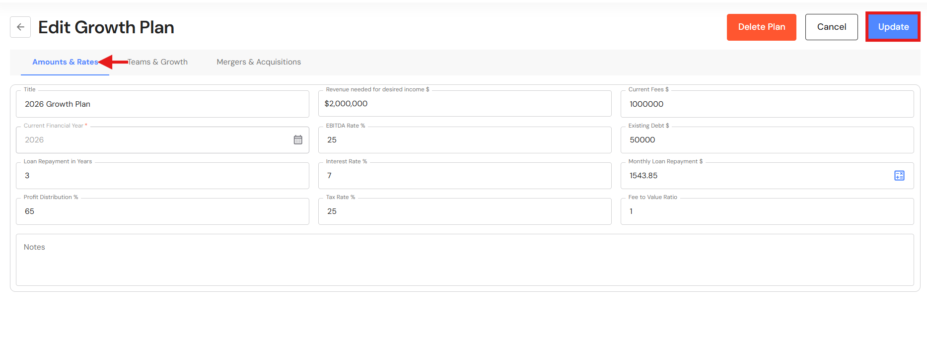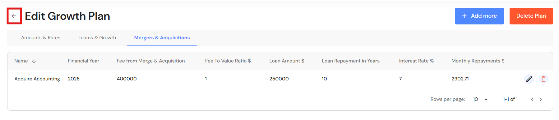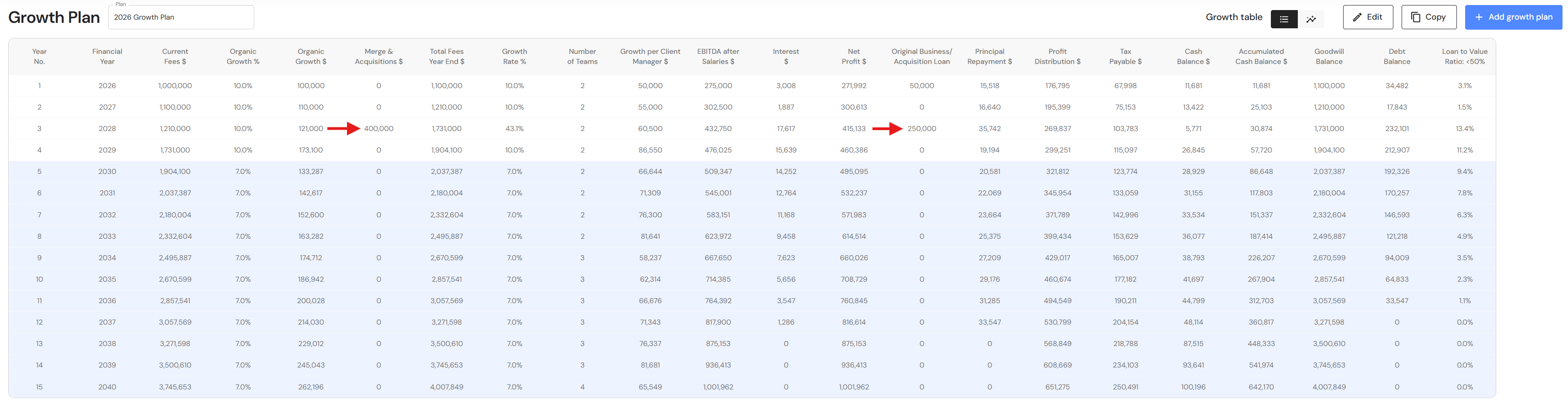 - Your Growth Plan will show the impact of revenue through acquisitions as well as any loans attached to the acquisition. In addition, the year the business reaches your revenue and ideal income goals will be brought forward.