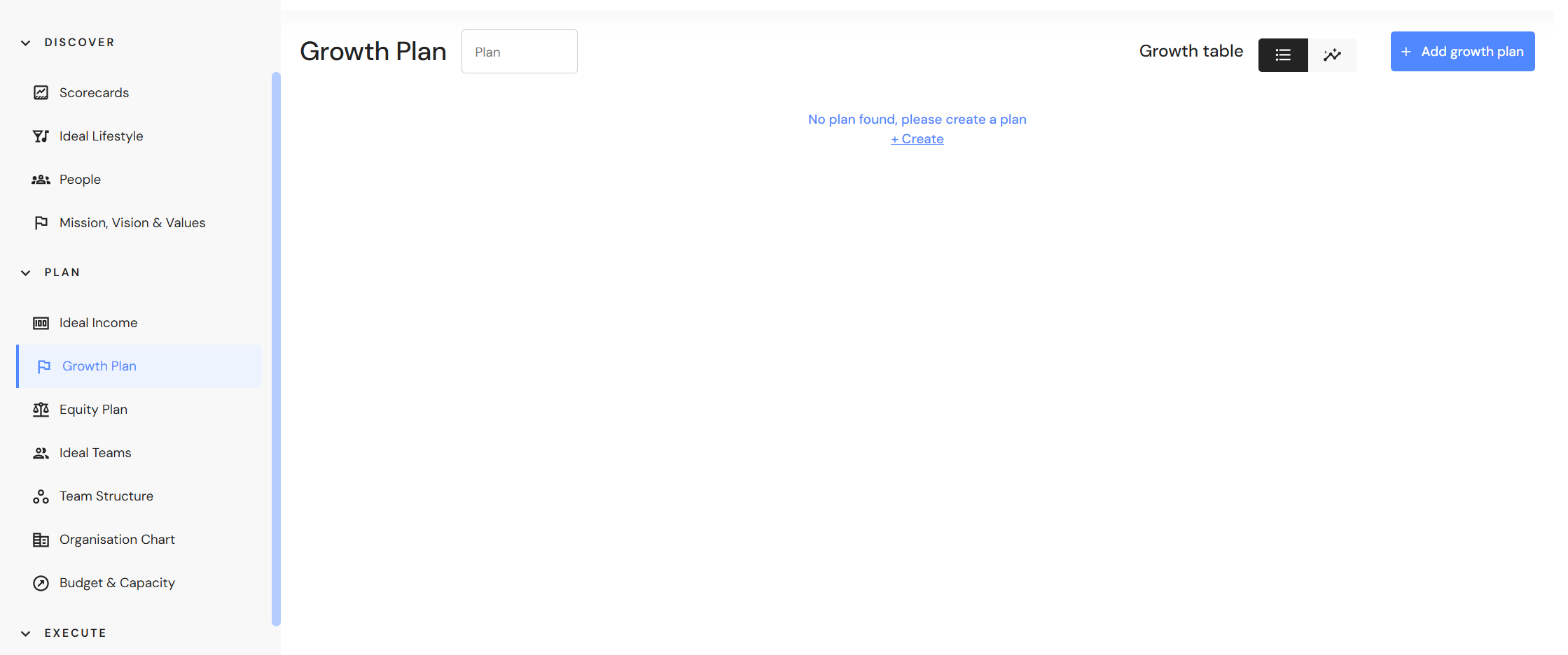 - Click on' + Add growth plan' (or '+ Create' for first time plans).