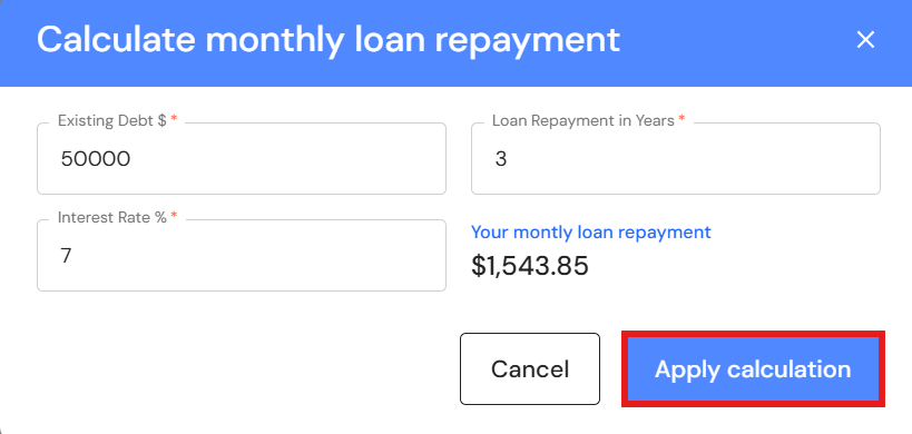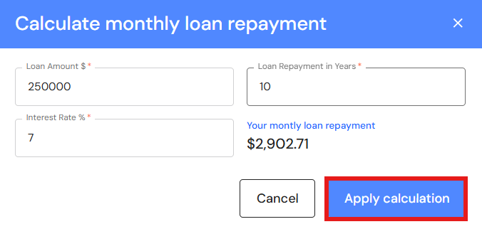 If you use the loan calculator, complete each field and click on 'Apply calculation'.