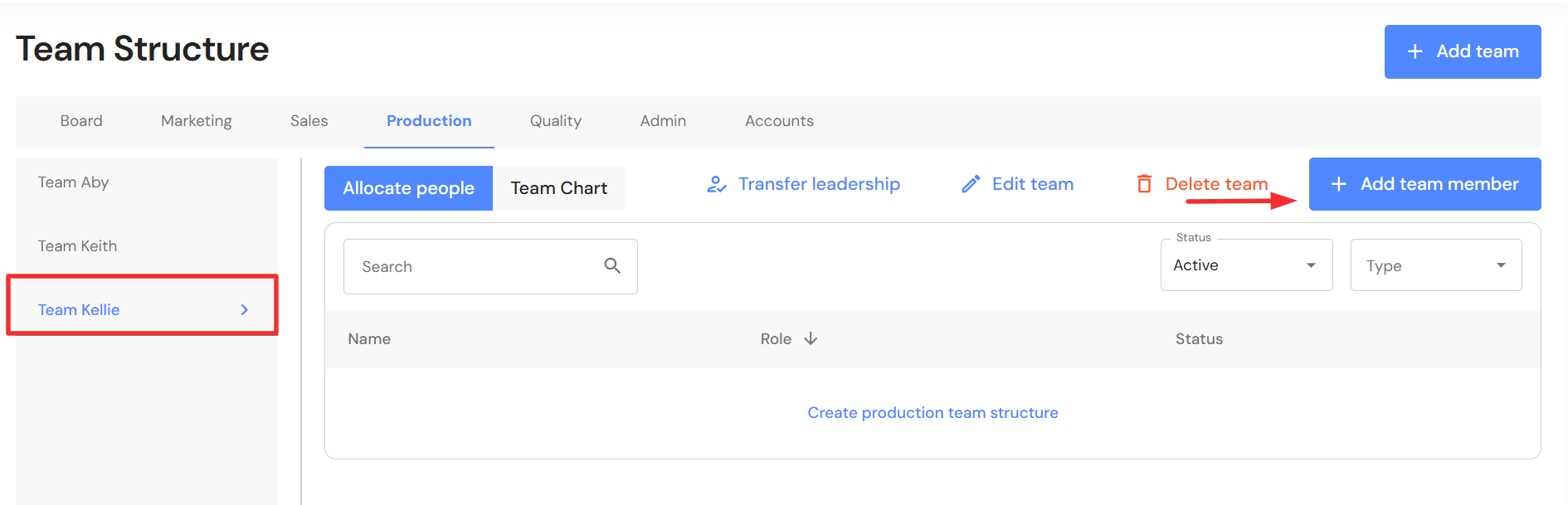 - Click on the team name in the grey panel. Then click on '+ Add team member'.