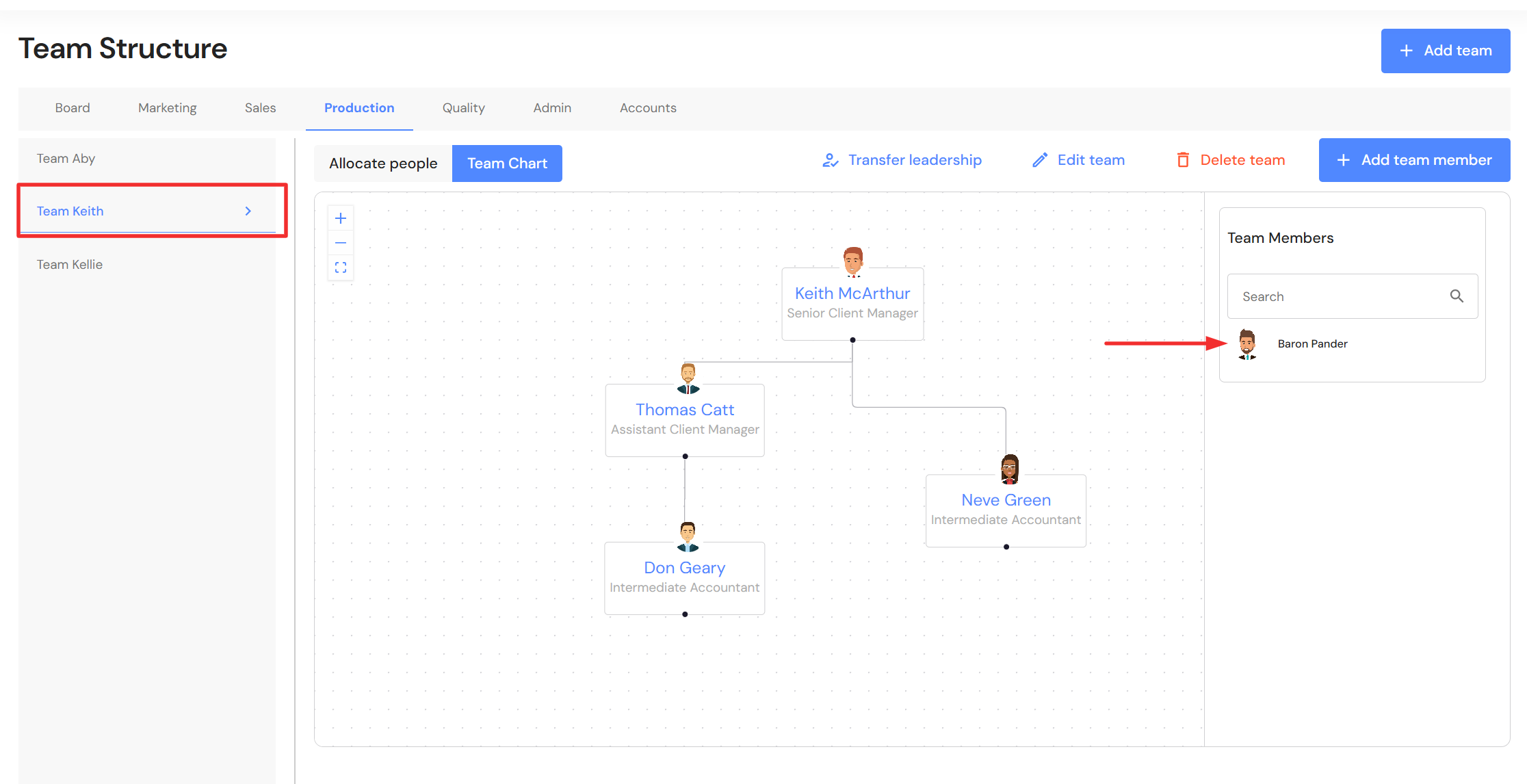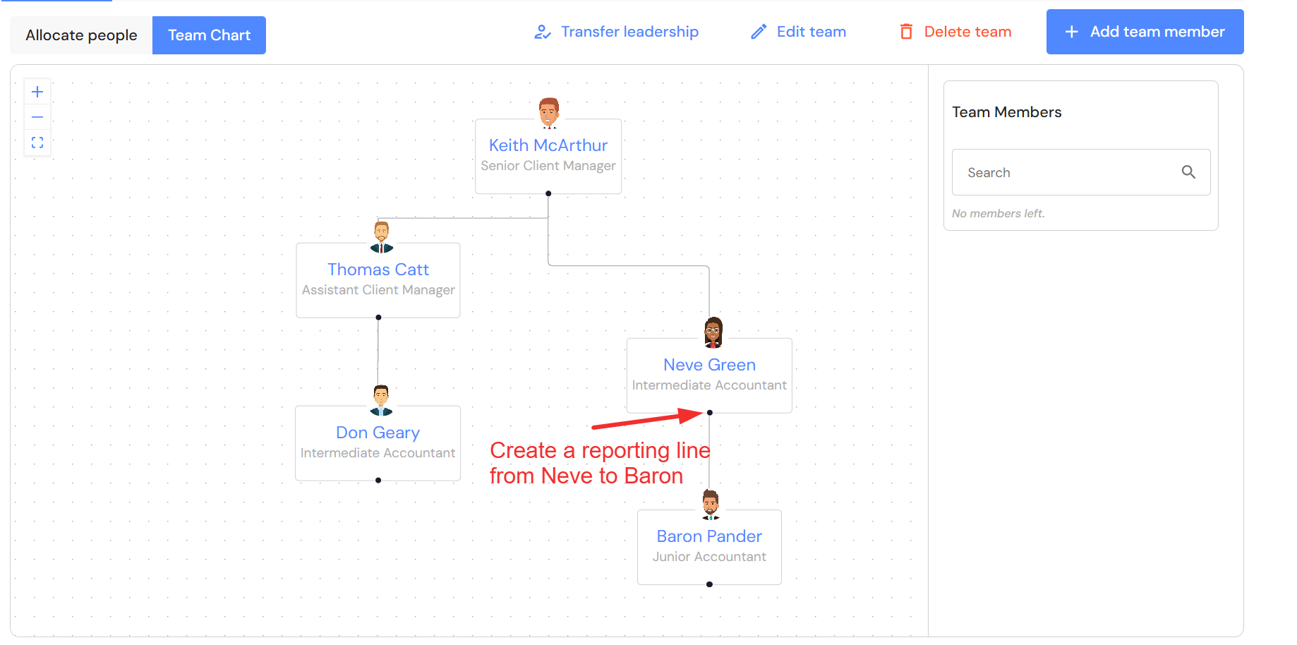 The team chart is where you create a visual representation of your team's structure and reporting lines.