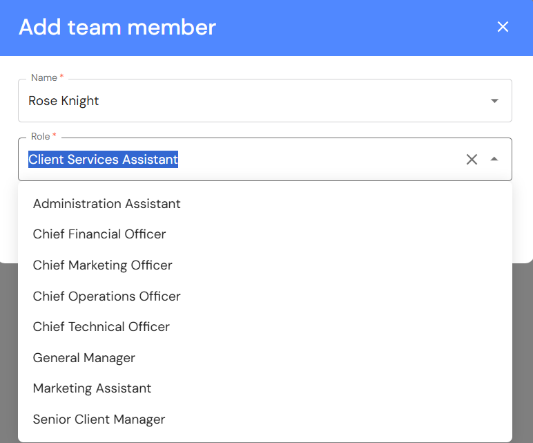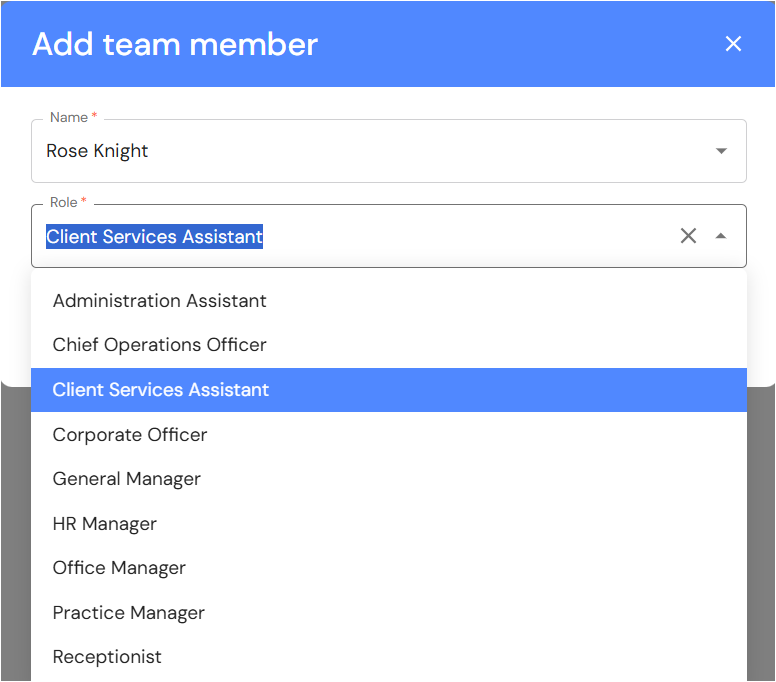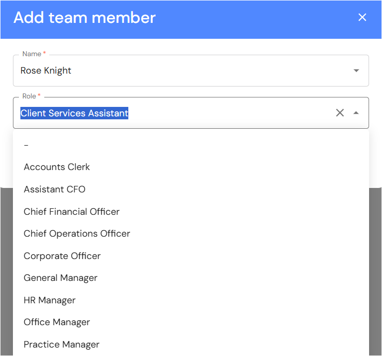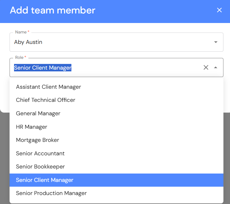 - The role assigned to the team member's profile in People will automatically prefill however, you can change the role to an accounts role from the dropdown list.