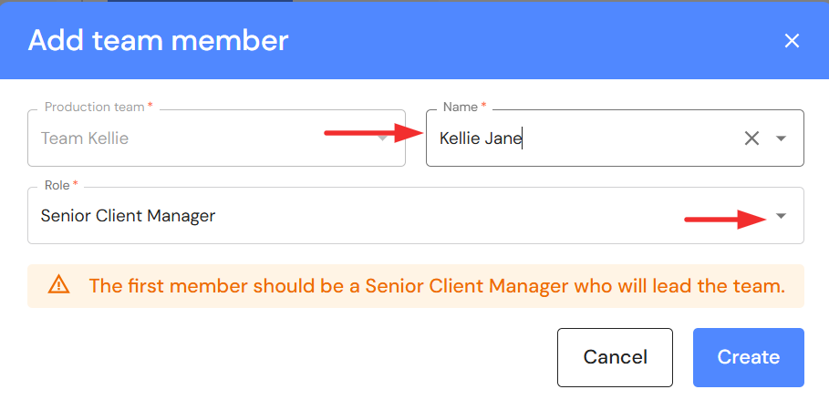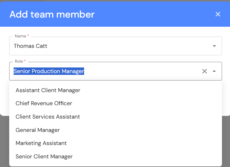 NB* The role assigned to the team member's profile in People will automatically prefill however, you can change the role to a production role from the dropdown list.