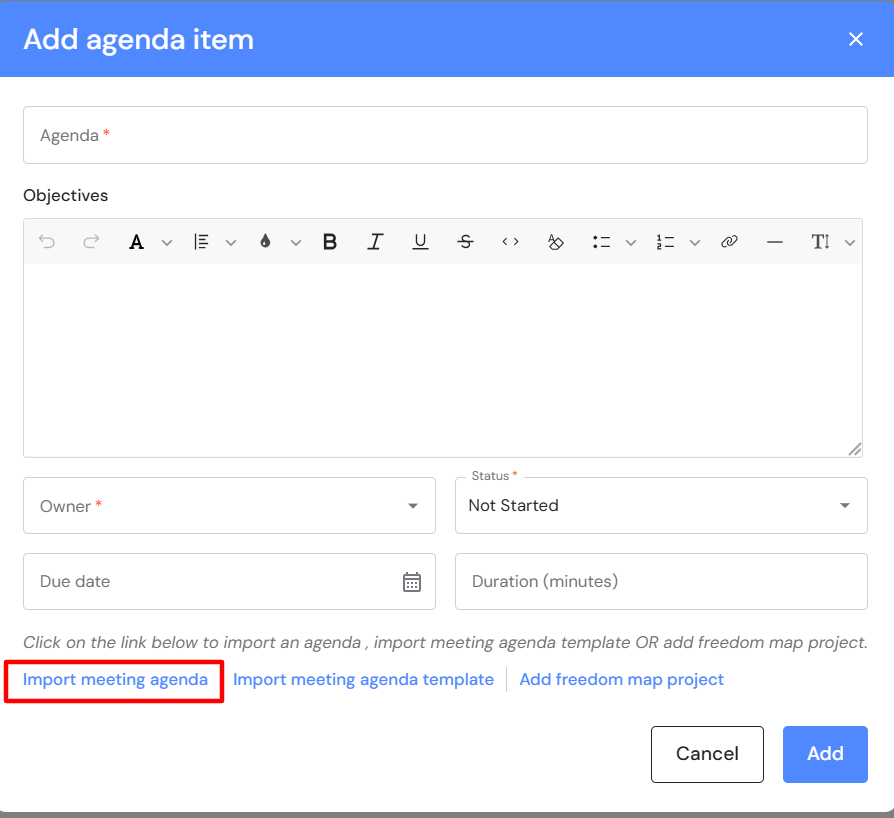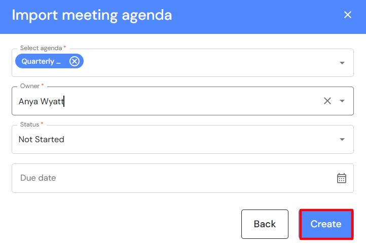 You can select more than one agenda and import them all at once. - Select an agenda owner.