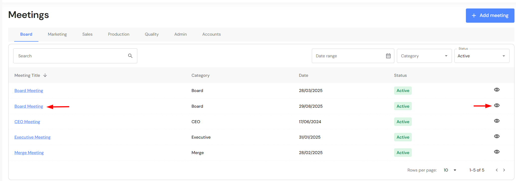 - Click on the meeting hyperlink (or the view icon) to access the meeting. Right click to open the meeting in a new chrome tab.