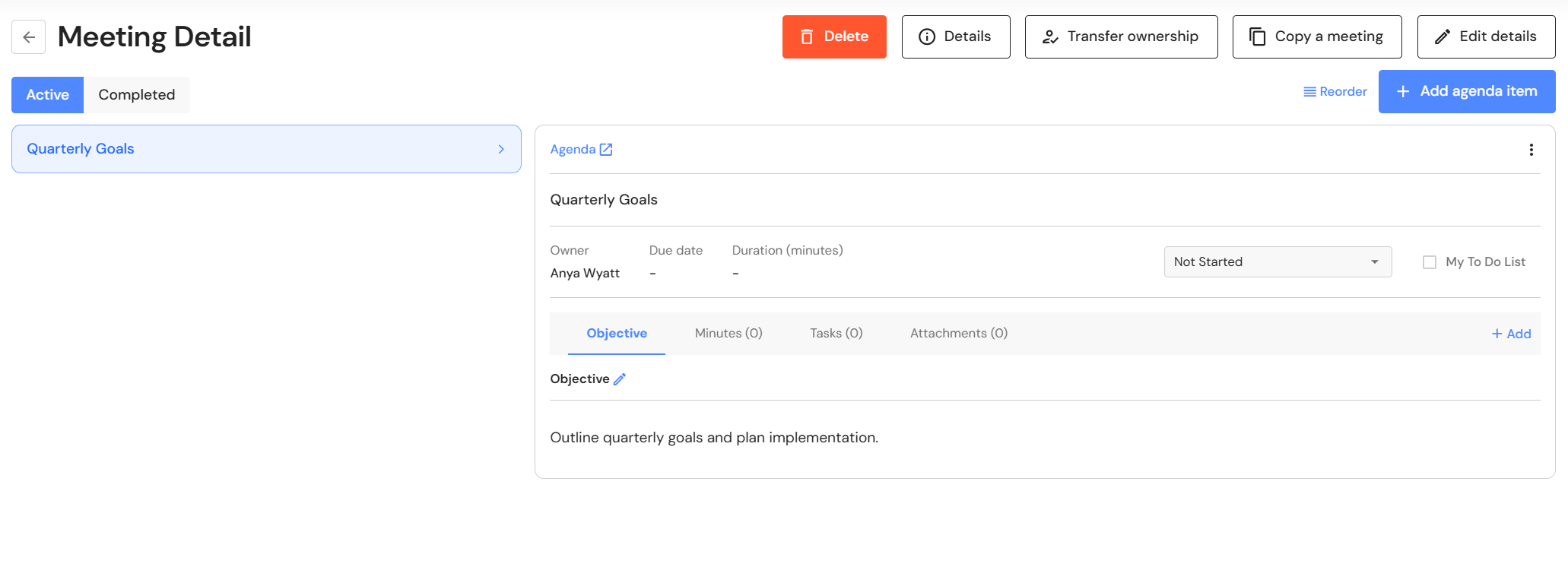 - Select an agenda from the dropdown list e.g. Quarterly Goals.