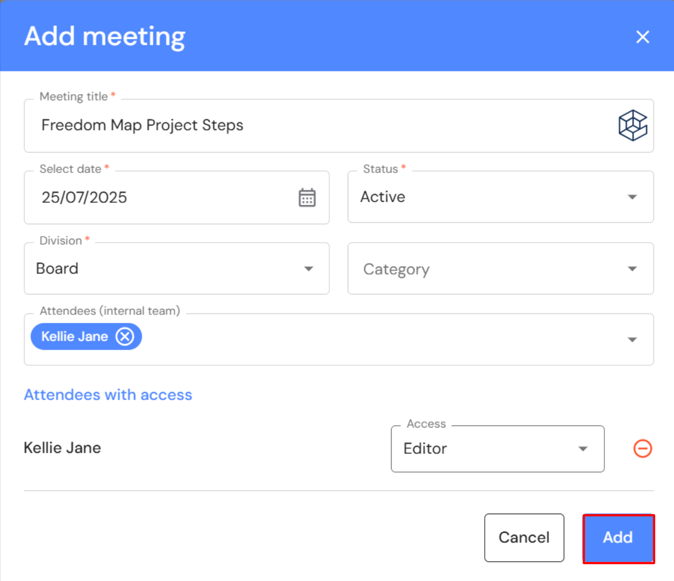 - Include additional attendees (optional). Select Viewer or Editor access for each attendee.