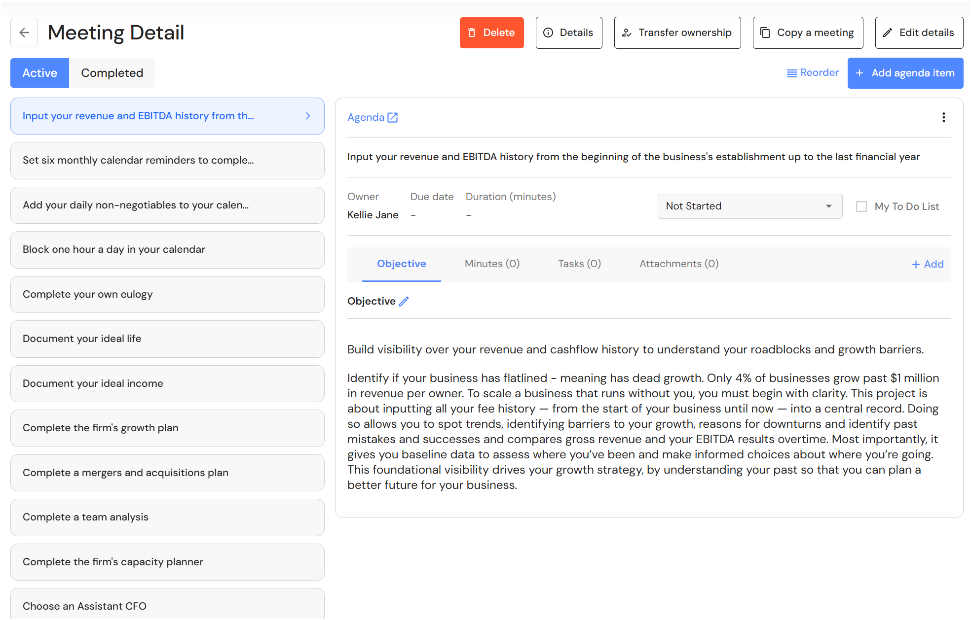 The owner will be assigned to each agenda item. The owner is responsible to lead the completion of the agenda items. Each agendas can be re-assigned to other team members later. - Leave the status as 'Not started'.