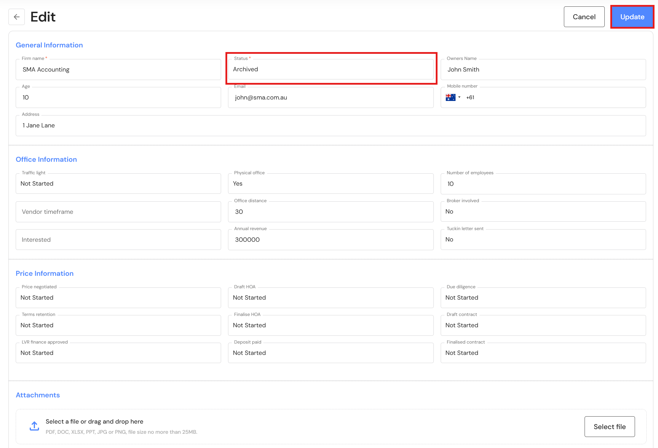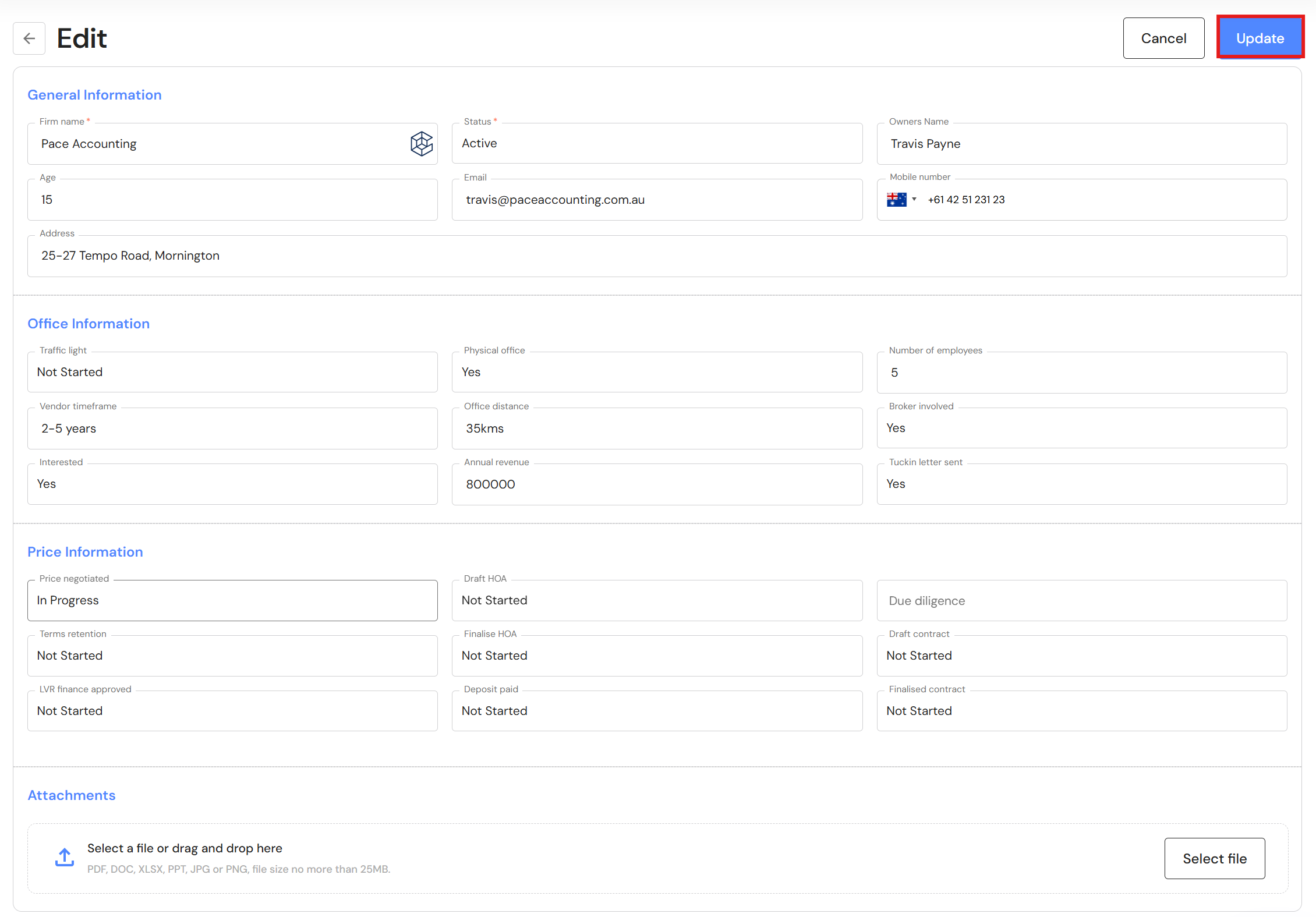 To edit a potential acquisition, click on the edit icon next to the business. When you are finished with the changes, click on 'Update'.
