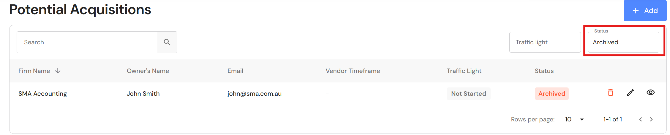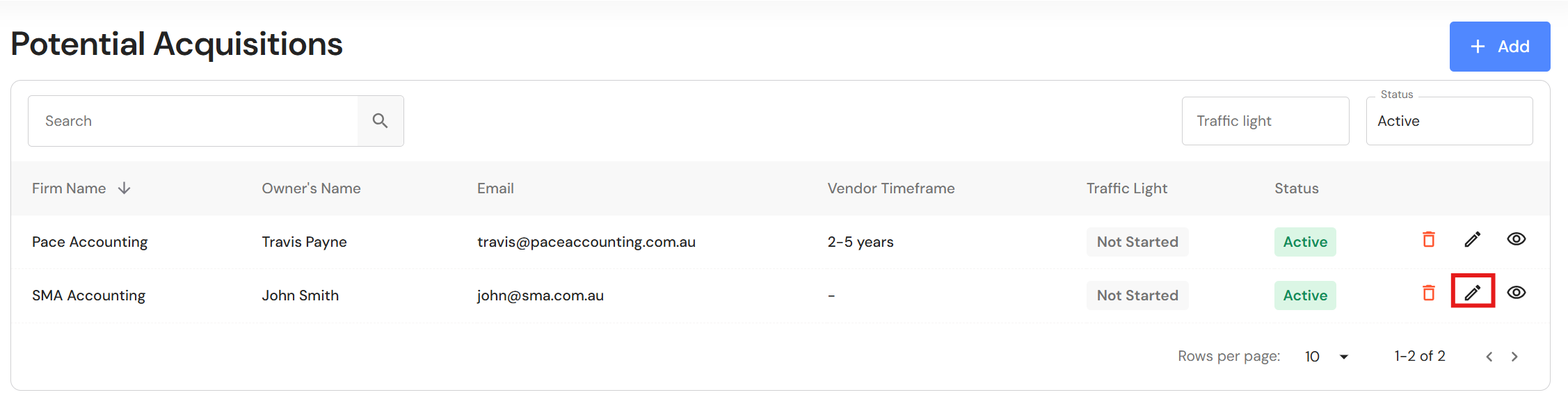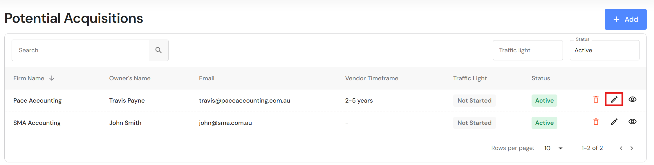 To archive a potential acquisitions, click on the edit icon next to the business.