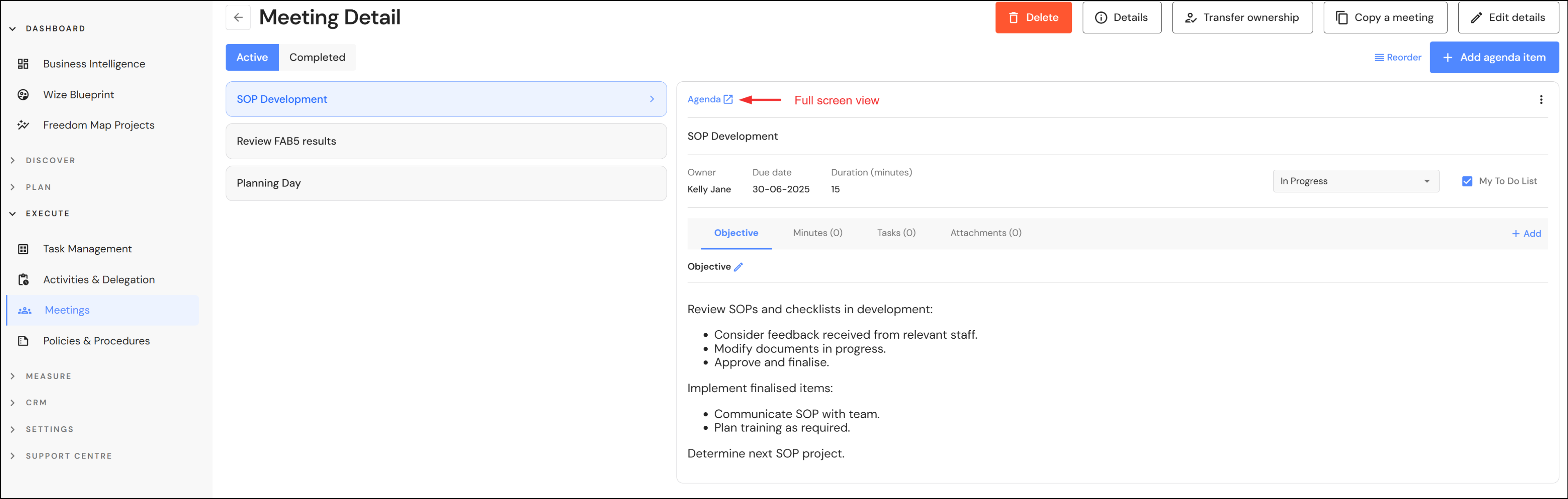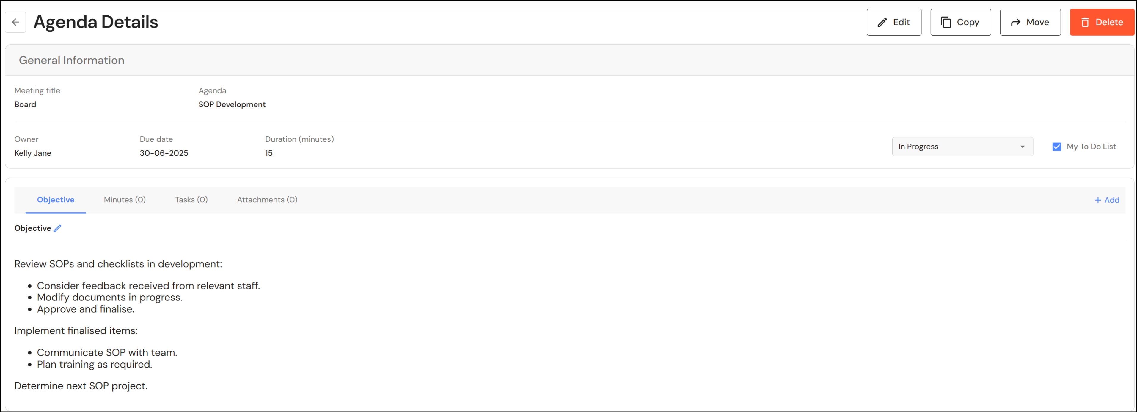 We have condensed the meeting agenda interface to deliver visual clarity, while also making it easier to add minutes and assign tasks 'on the fly' as you progress through each meeting topic.