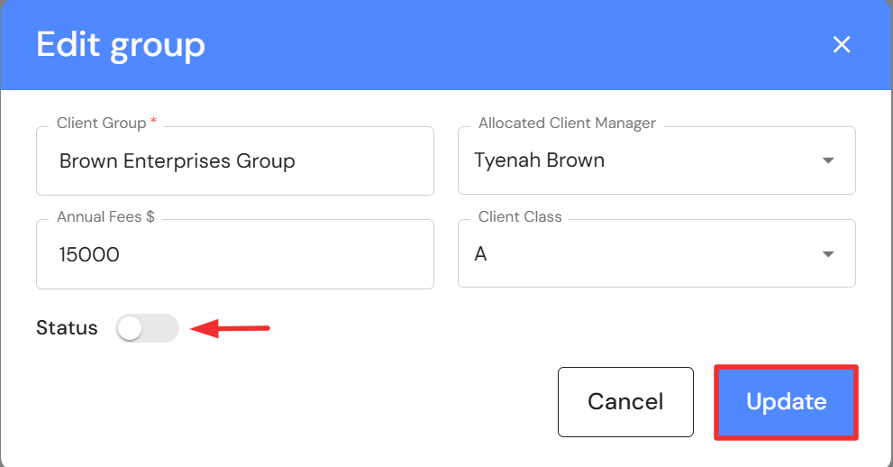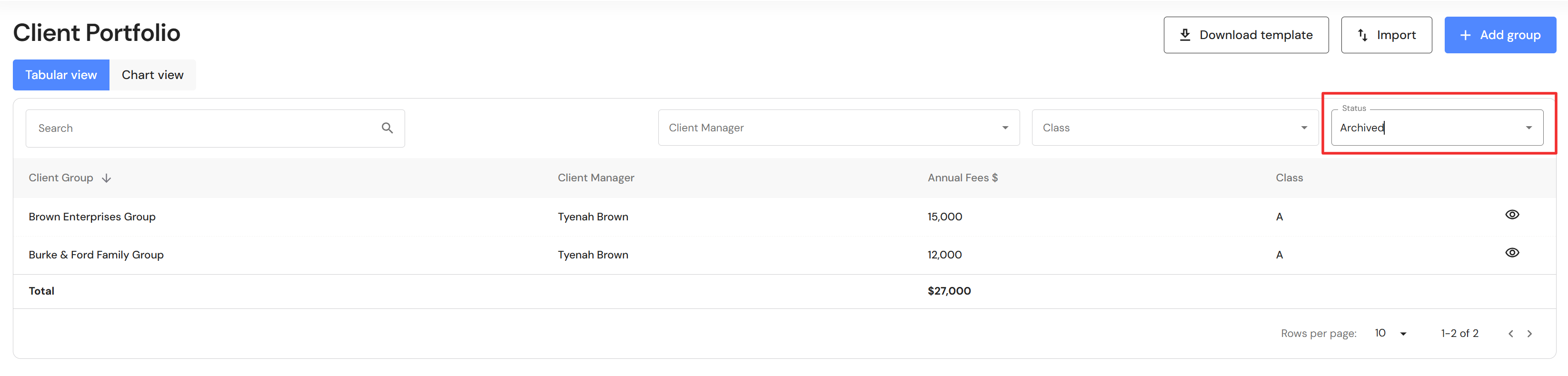 - To view the list of archived client groups, change the status filter from 'Current' to 'Archived'.