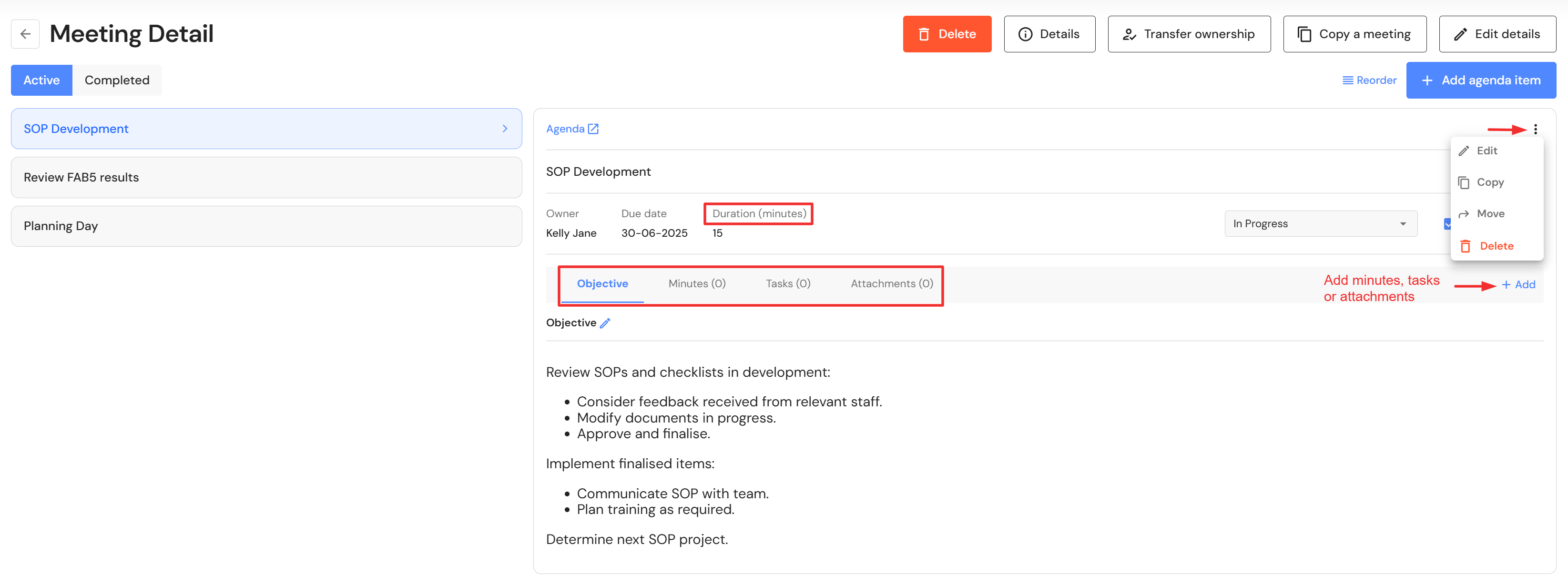 - a 'Duration (minutes)' field allows users to assign a discussion timeframe to each agenda item to help attendees stay on track and finish the meeting on time.