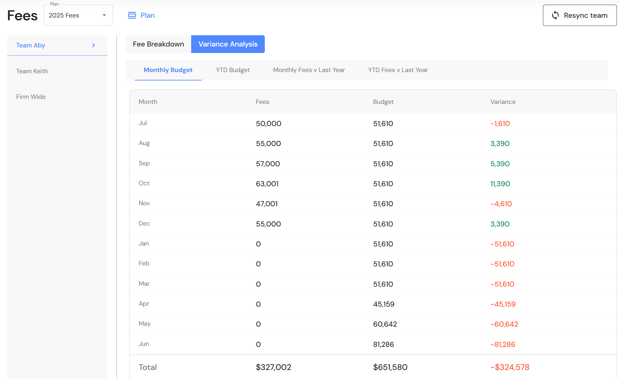 - YTD Budget - Compare the year to date (YTD) variance between your current year cumulative fees and cumulative budget.