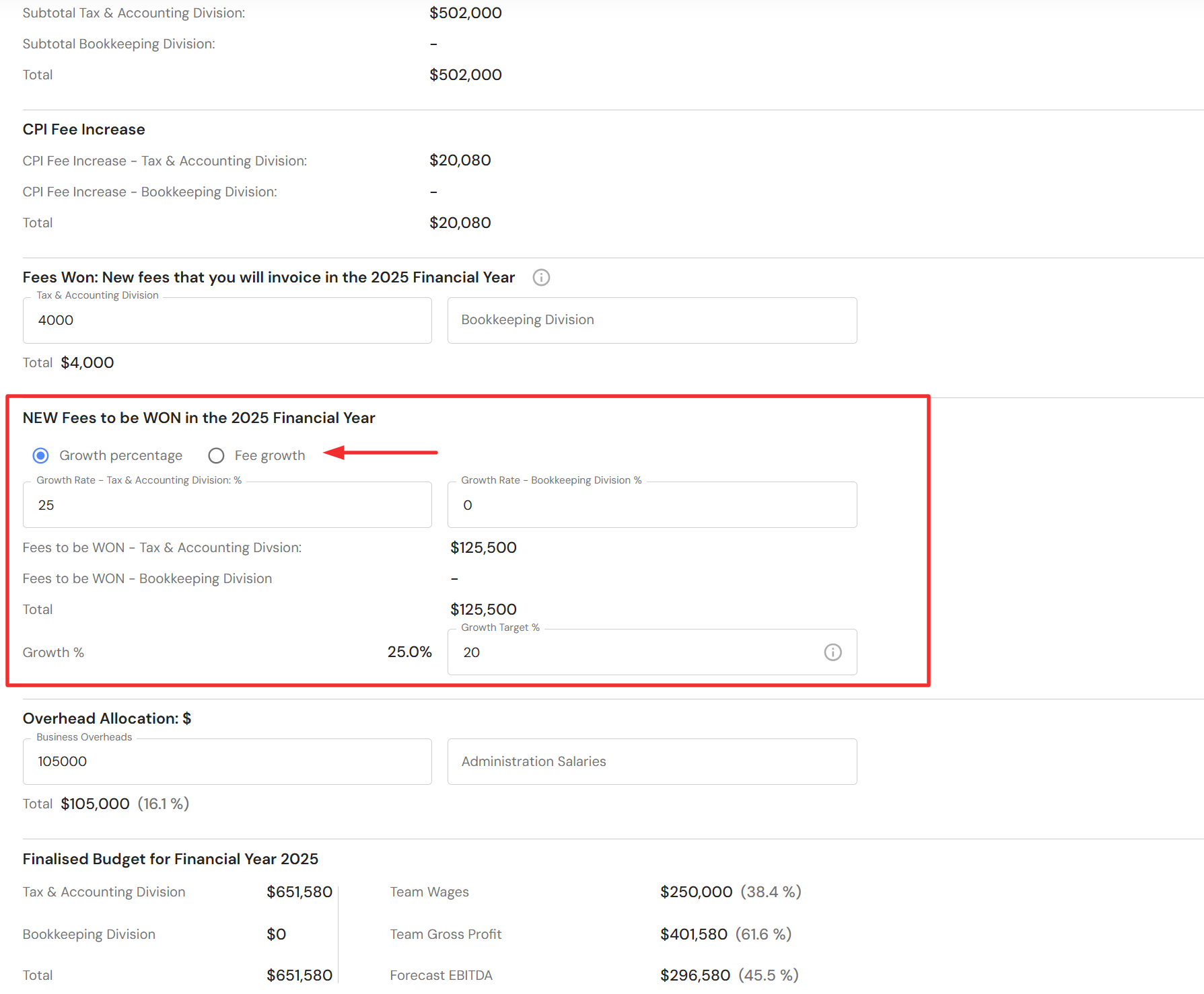 When you prepare your annual fee budget, you can now choose to add annual fee growth by percentage or dollar amount.