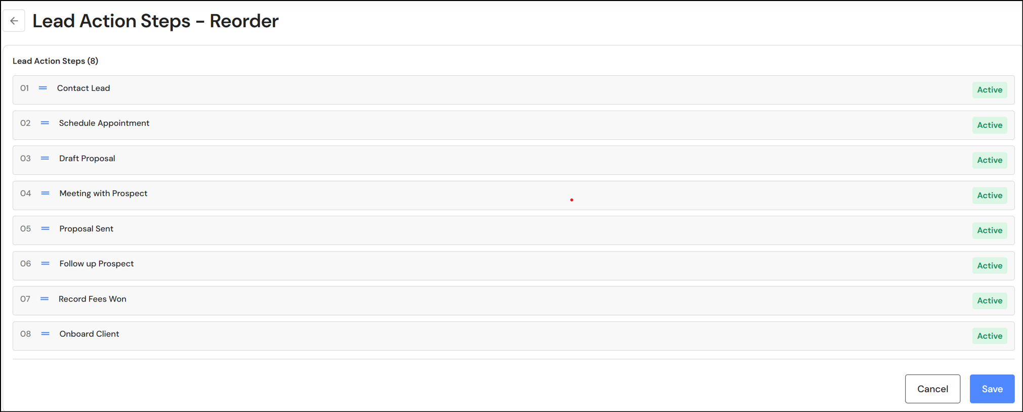 Executive, Administration Team and CFO users can set a default order for lead action steps in System Preferences > Lead Action Steps