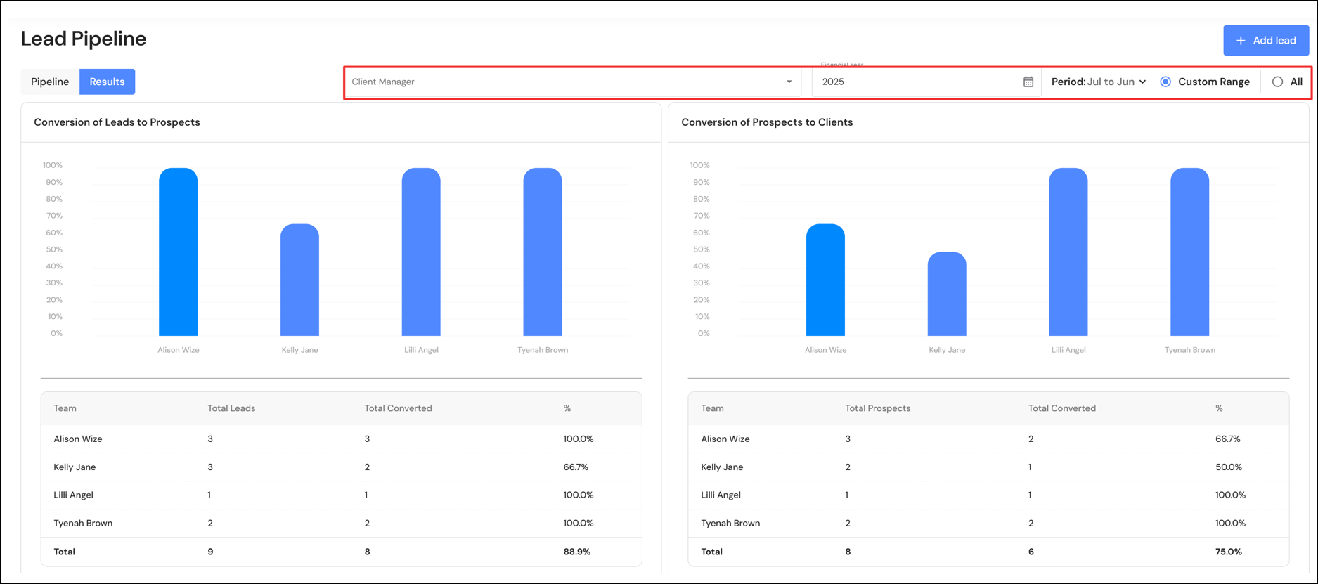The results tab will now show Lead Pipeline data by financial year. We have also added filters so charts and graphs can be displayed for a specific period and/or by client managers.