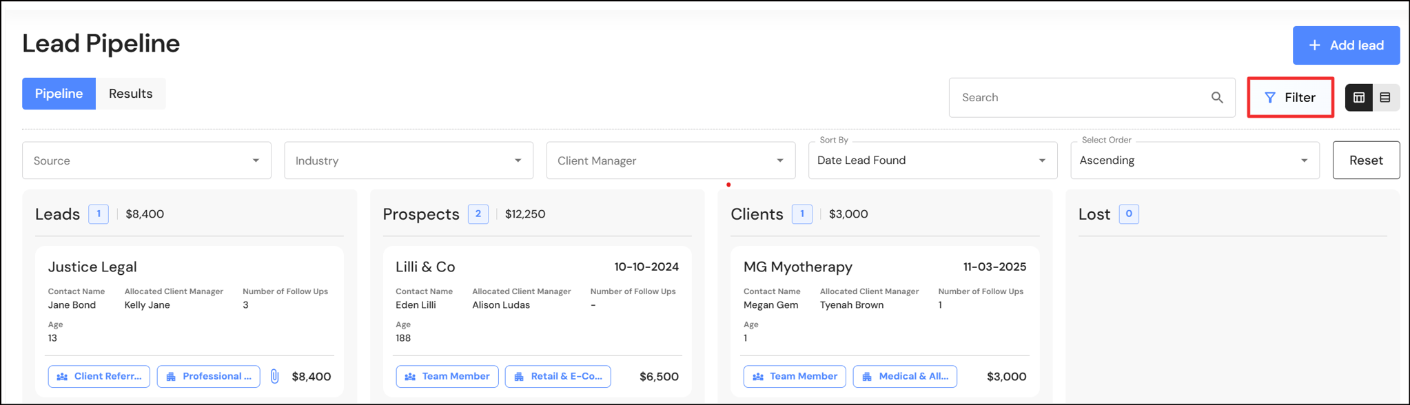 We have added a new sort filter to the Lead Pipeline Kanban and list view.