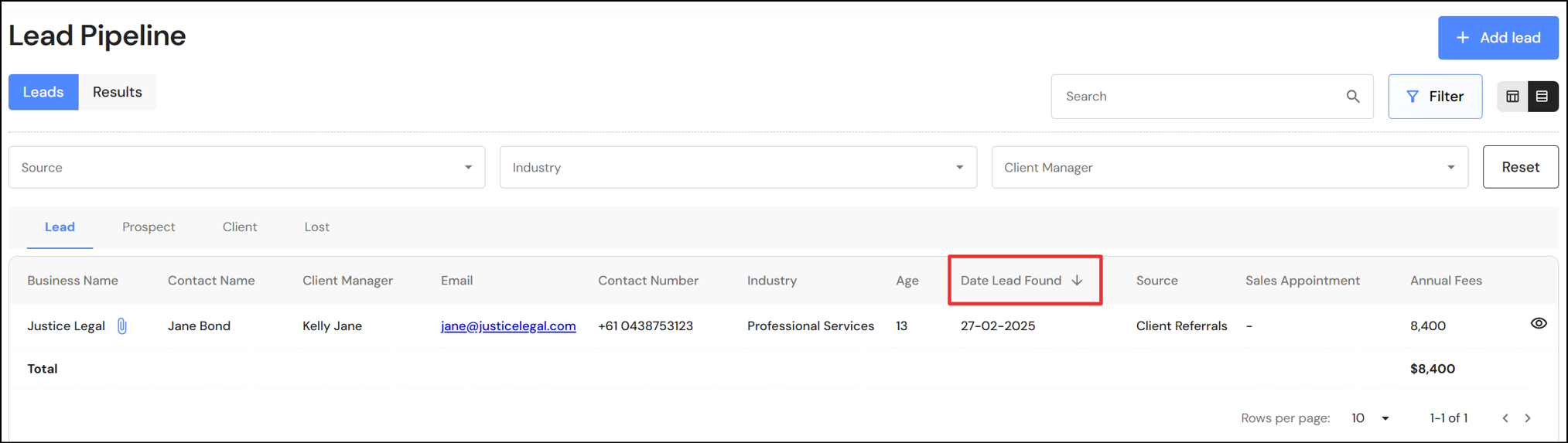 In the list view, users can apply sort filters to the lead source, client industry for client manager. In addition, you can now click on the following headings and sort columns by ascending or descending order: