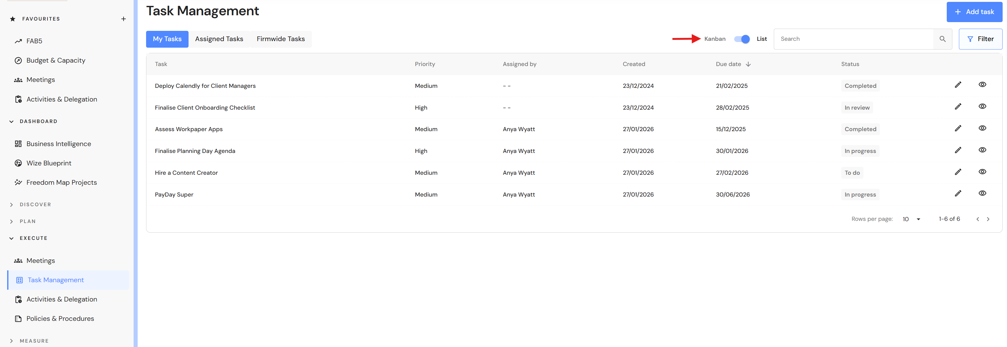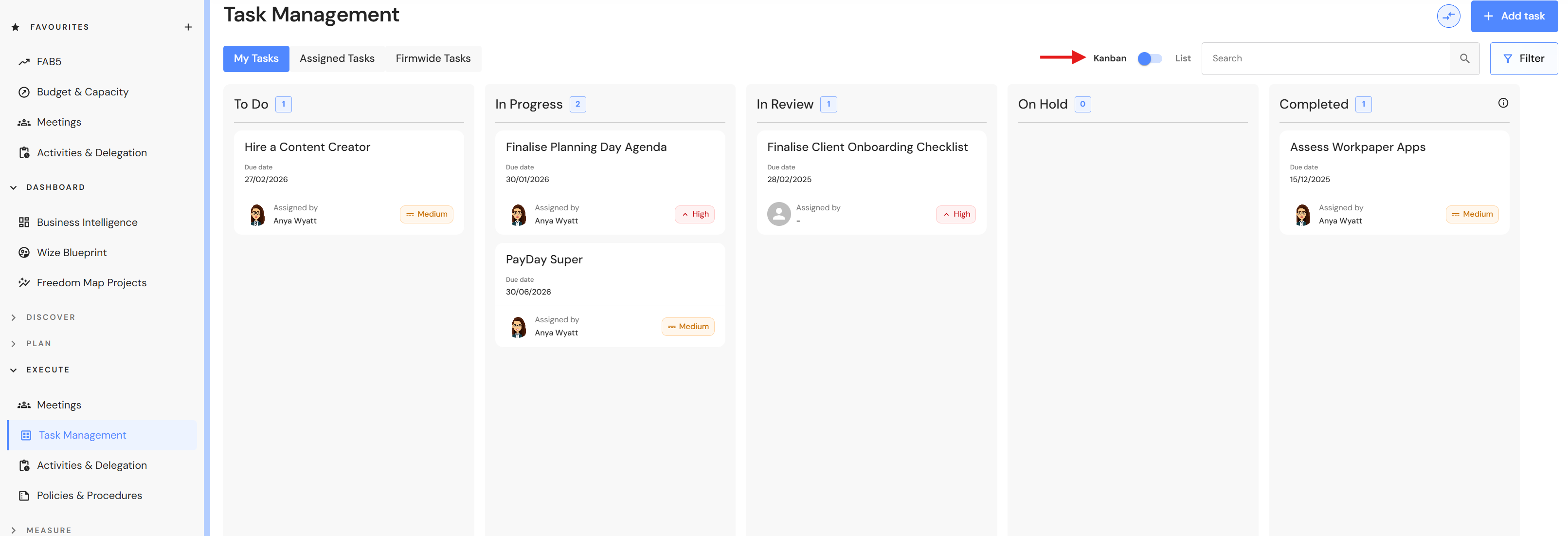 We have introduced a Kanban board in Task Management to make it easier to track your work. Update task statuses by simply dragging and dropping each task as you progress.