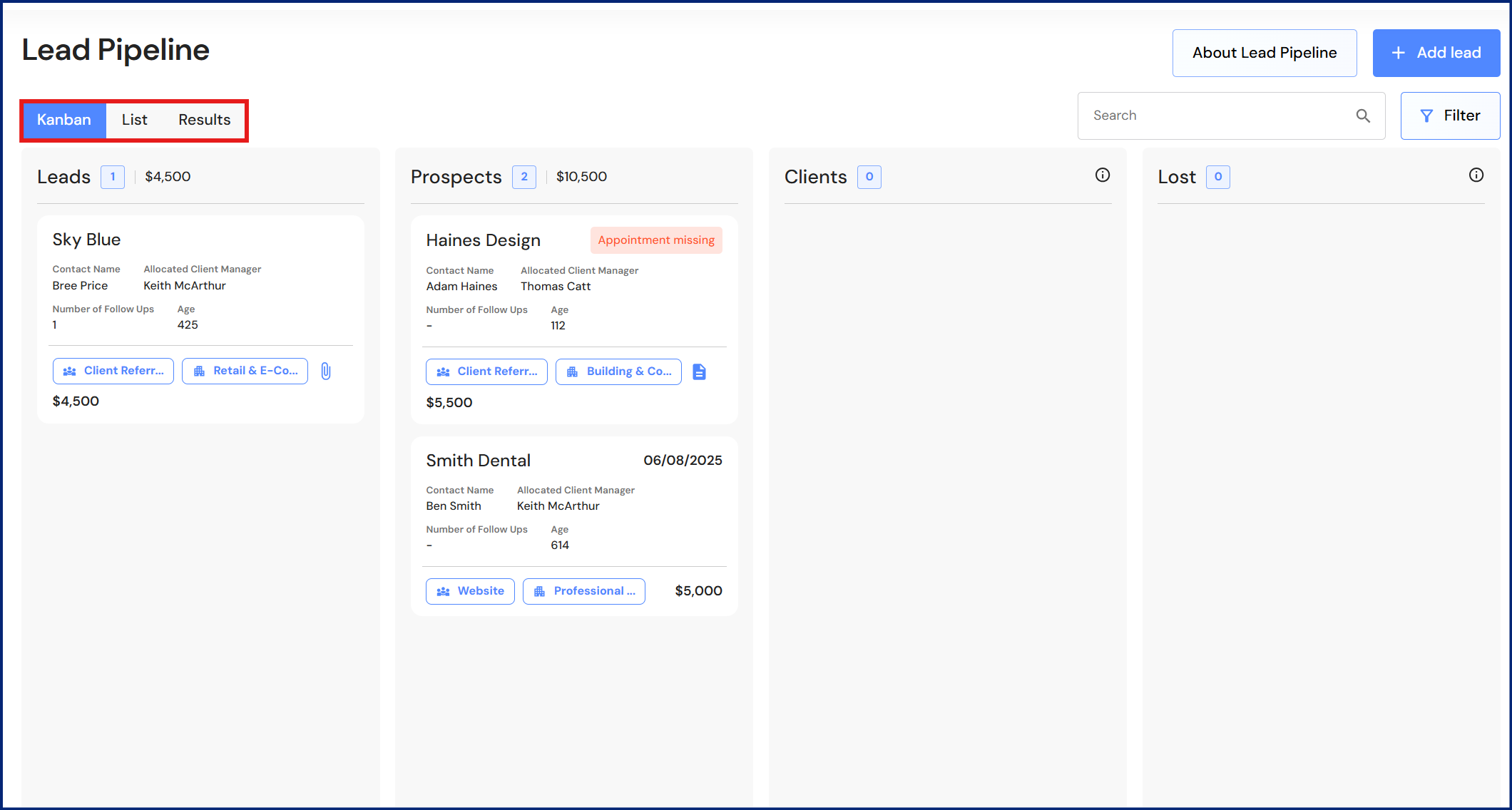 - Click on a client in the prospects column.
