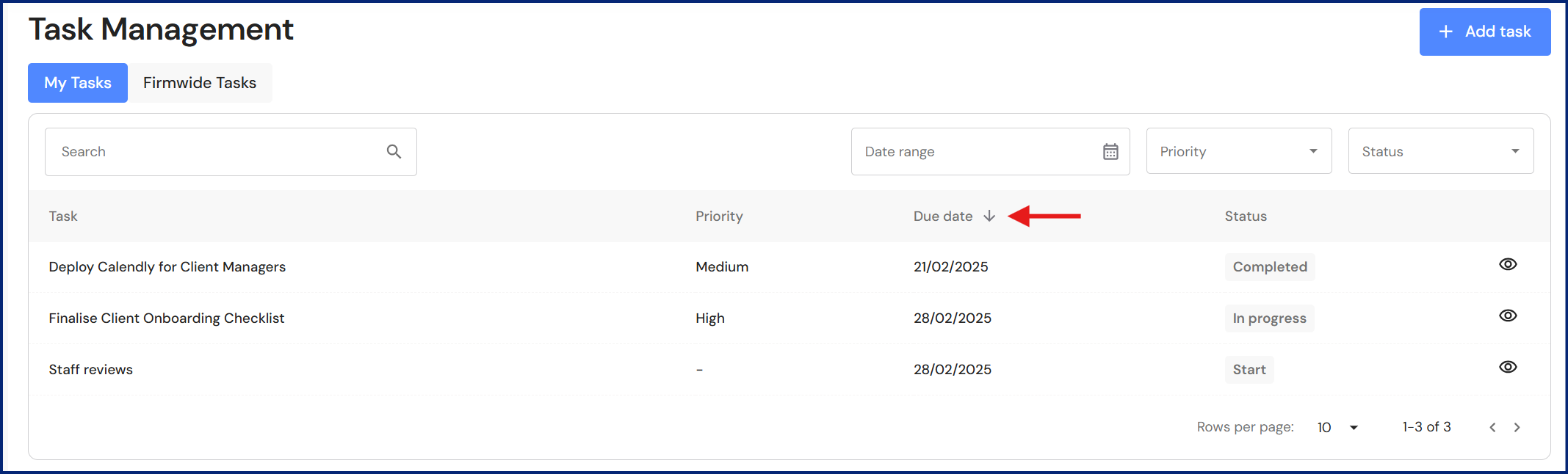 Users can set a default sorting column in 'My Tasks' and 'Firmwide Tasks'. Click on your preferred column header and it will be retained until you change it.