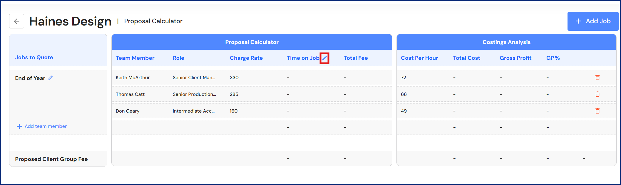 - Click on the edit icon next to 'Time on Job' to enter the time (in hours) each person will spend on the job.