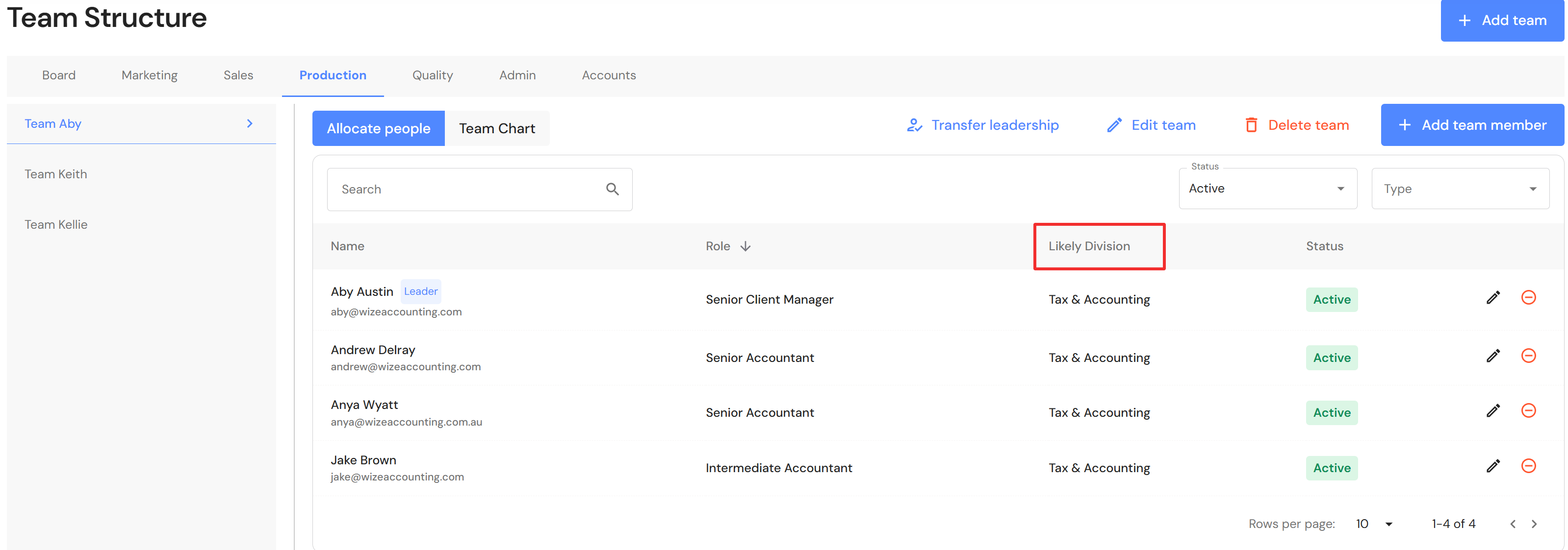 Team Structure: Production Team - Likely Division for Financial Year Rollover