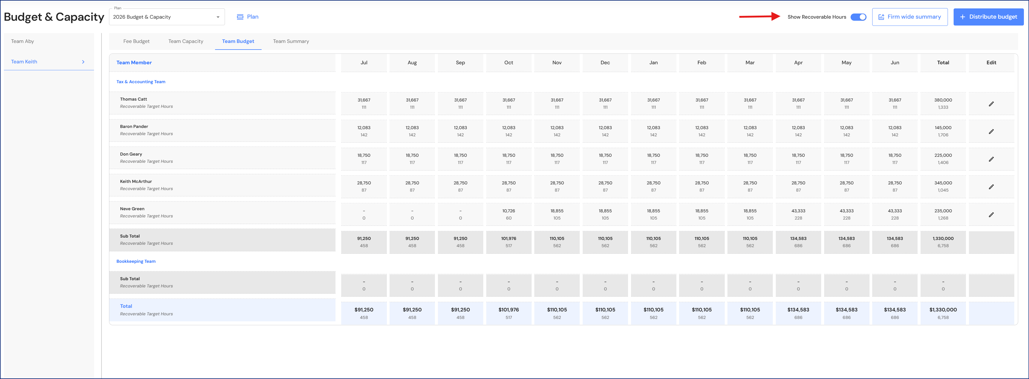 - The addition of monthly recoverable hours in the 'Team Budget' tab. Click on the toggle to show/hide recoverable hours.