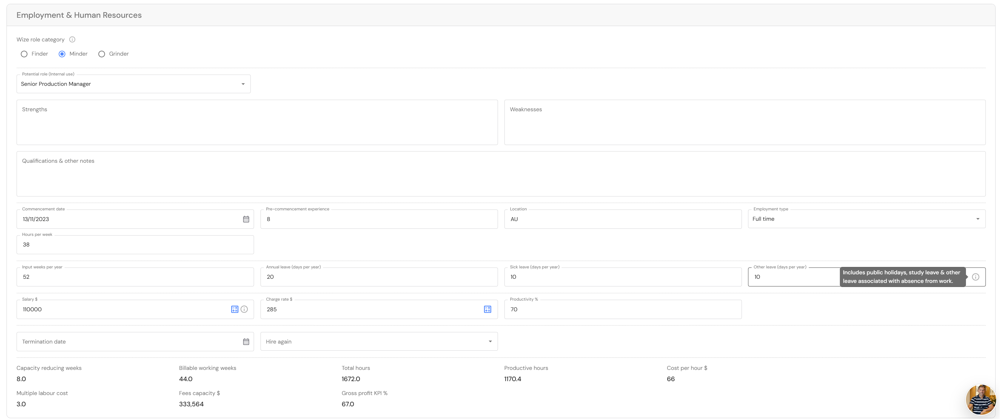 Leave entitlements are now recorded in days rather than weeks. The total number of days entered across each leave category will be converted into capacity reducing weeks, which in turn determine the billable working weeks available for capacity planning.