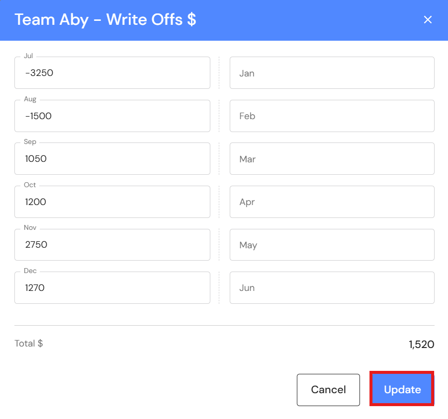 - Enter the team's net Write Offs (or Write Ons) for the relevant month. Enter write offs with a minus.