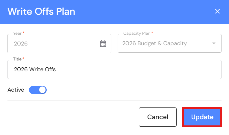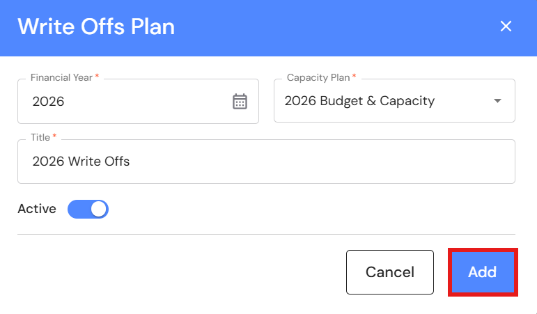 - Switch the 'Active' toggle on if you would like the Write Offs plan to be the default plan. NB* If you have the active toggle set to 'on' in more than one Write Offs plan, the newest plan will become the default.