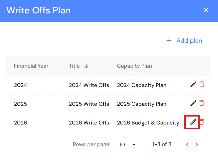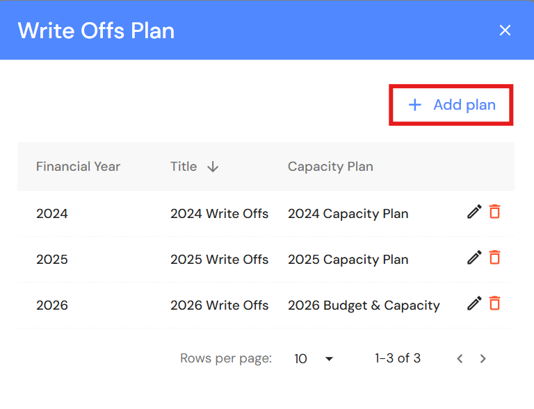 The Budget & Capacity plan is the foundation for all FAB5 schedules including Write Offs. In most cases, the Write Offs plan will automatically be created alongside the Budget & Capacity plan.
