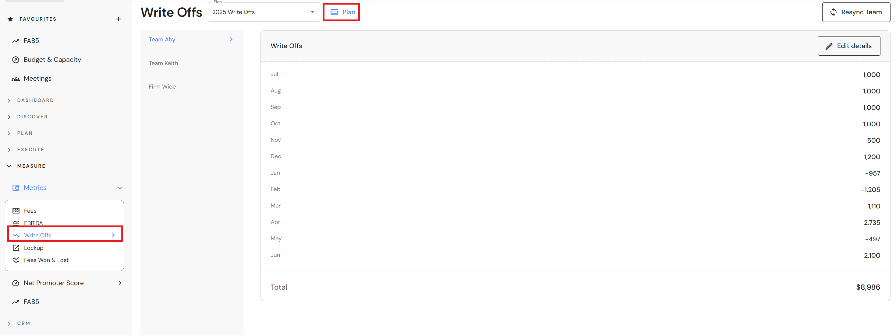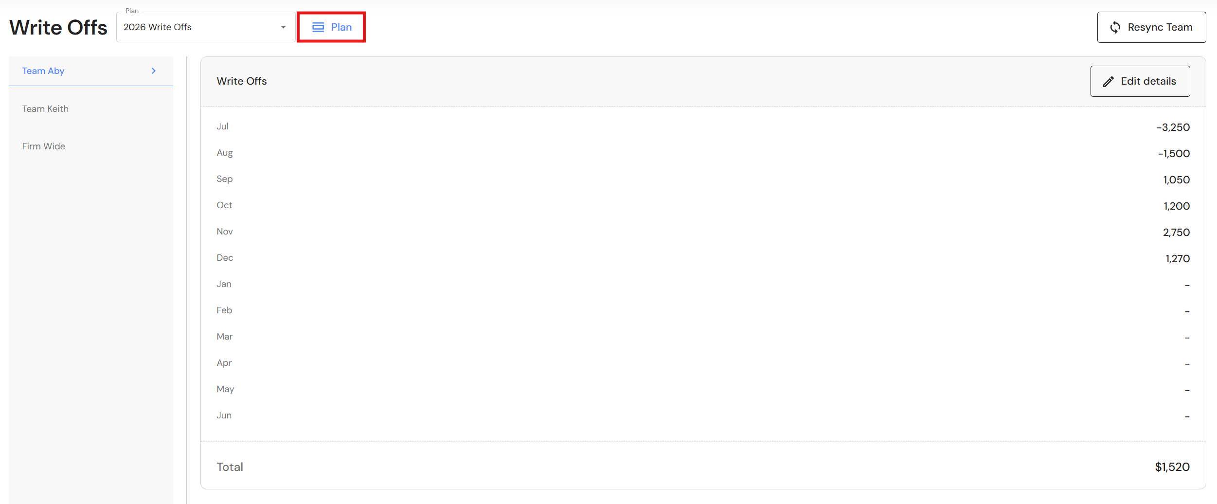 If you add more teams to your Budget & Capacity plan, click on 'Actions β Refresh and sync teams' and the Write Offs plan will update with the team changes.